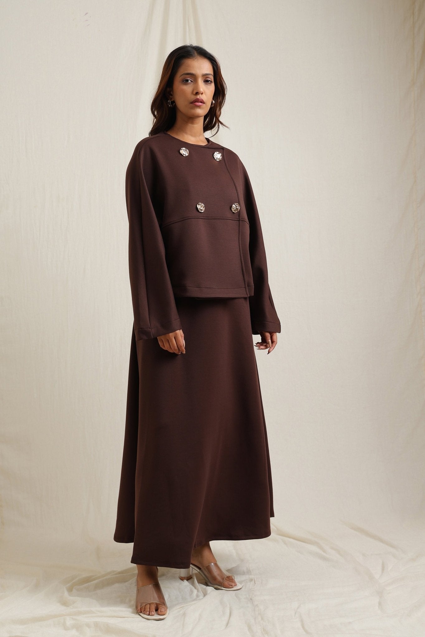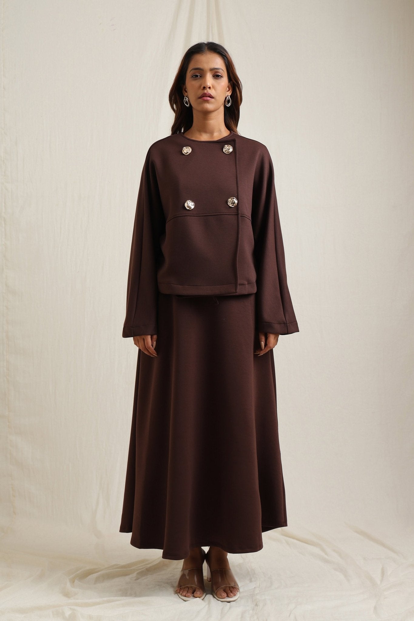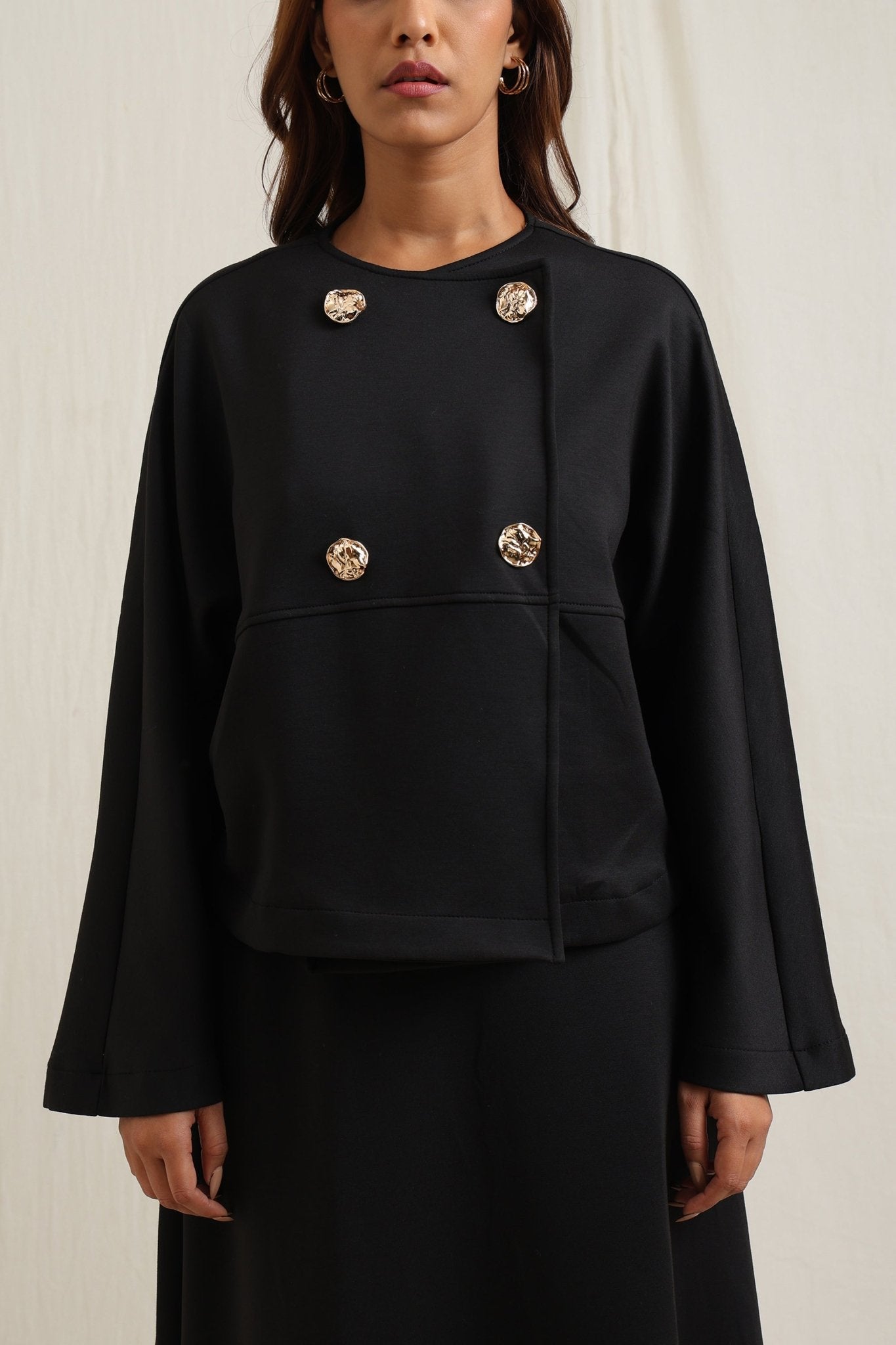 Regular price Rs. 7,350Batwing sleeve skirt set detailed with striking gold buttons for a touch of elegance.