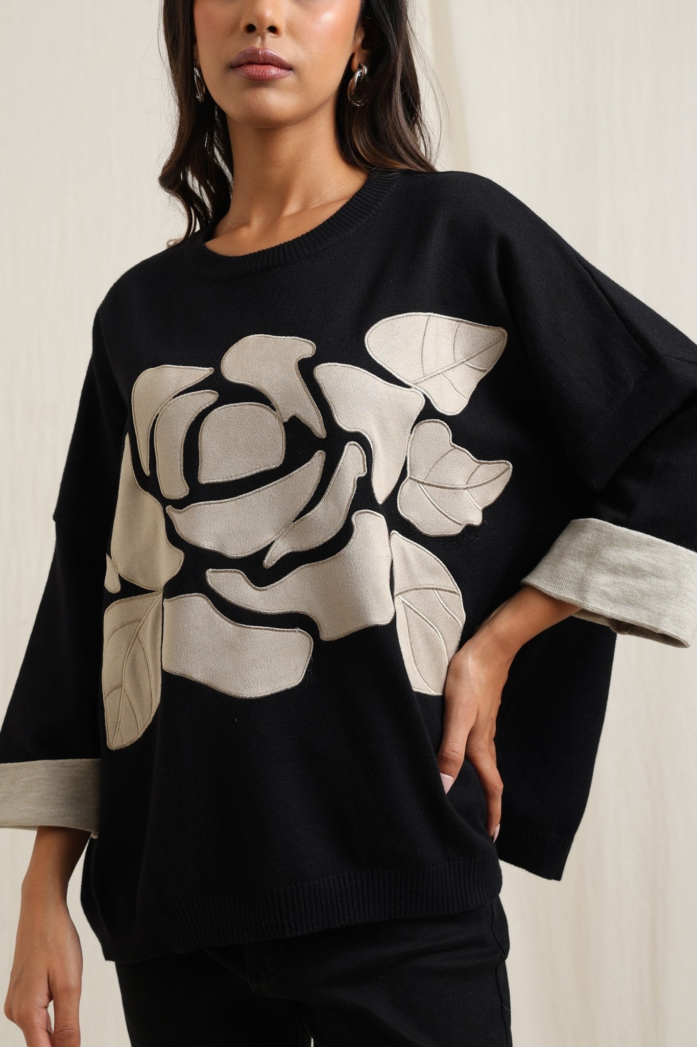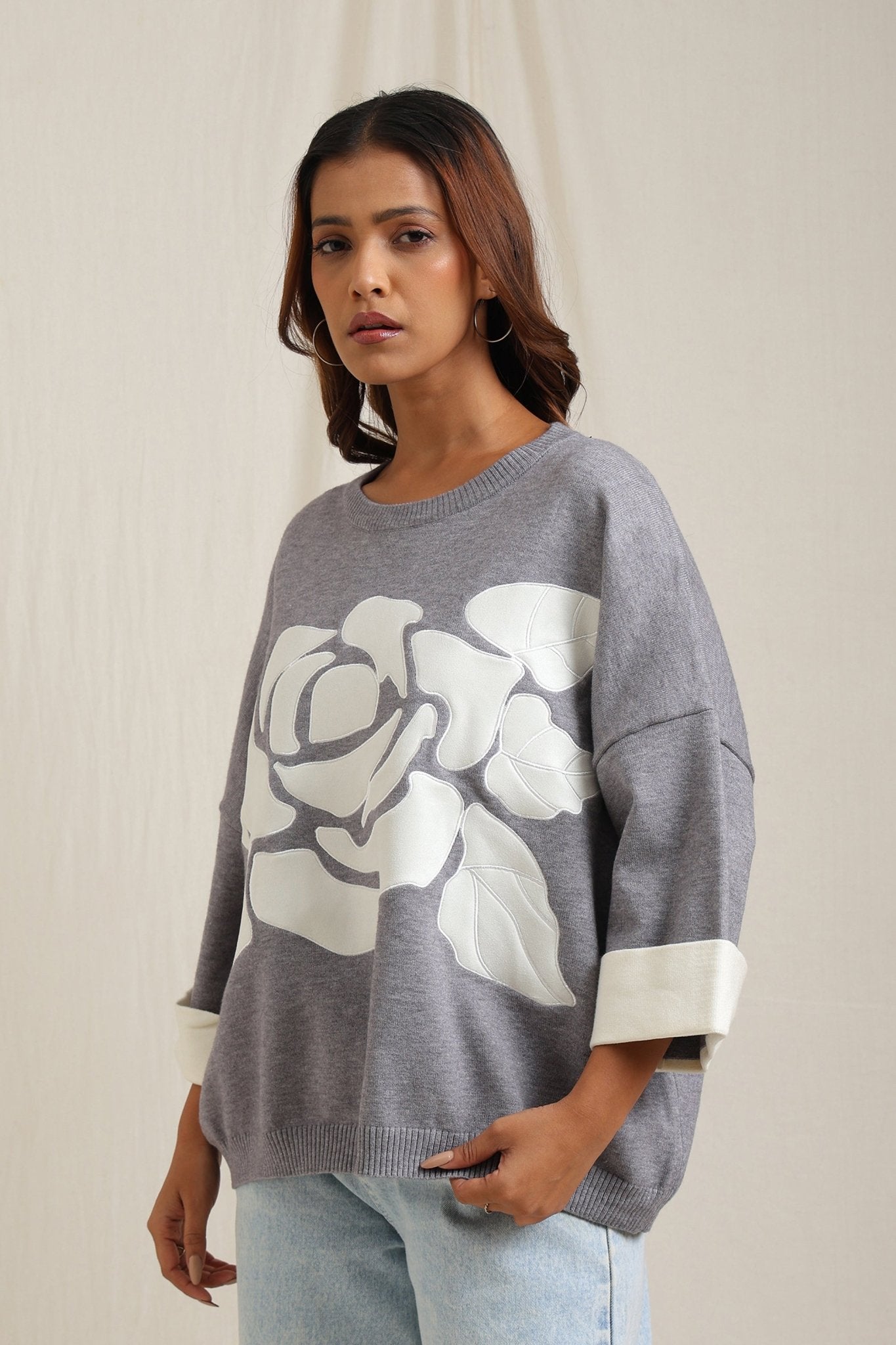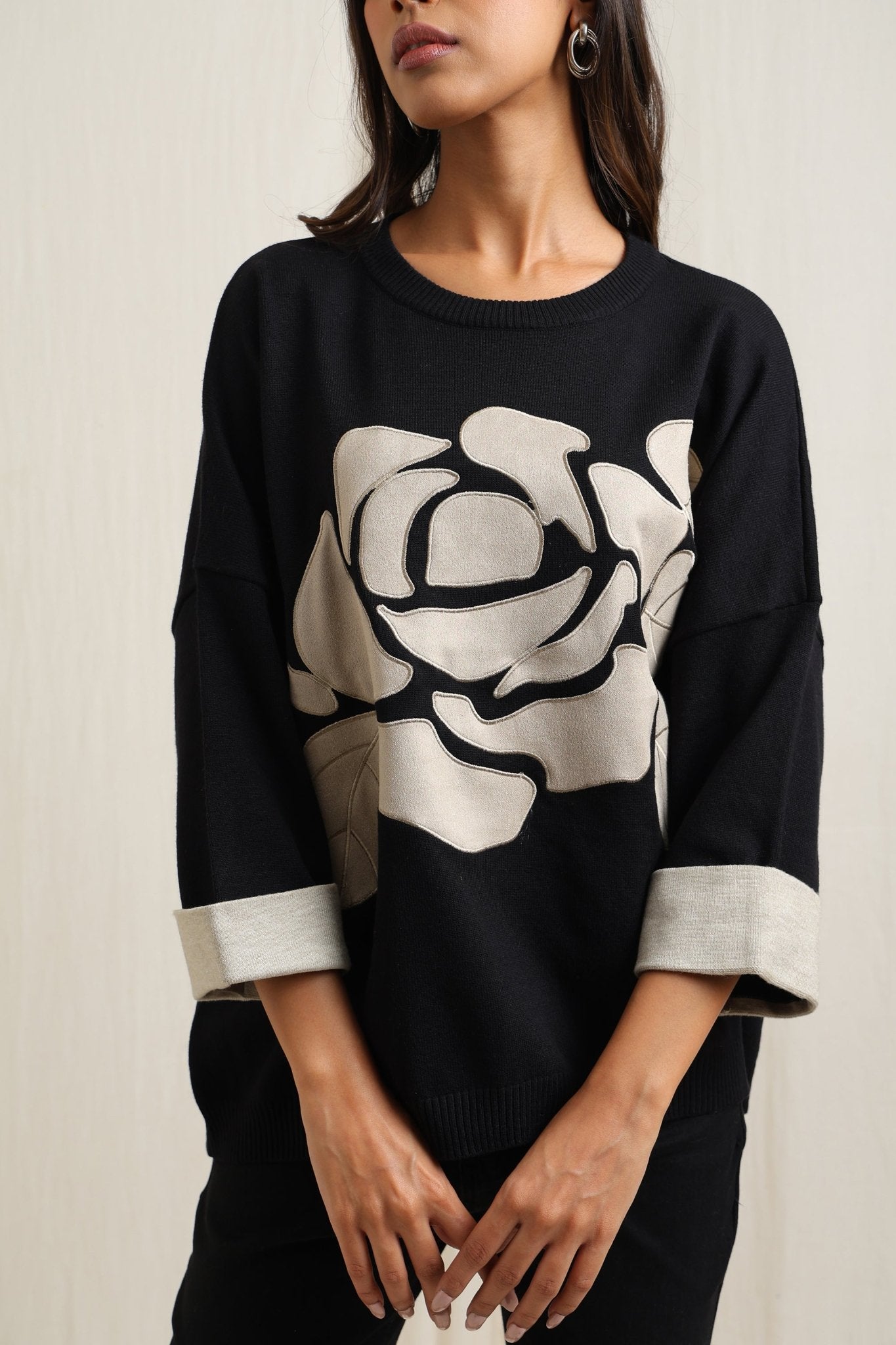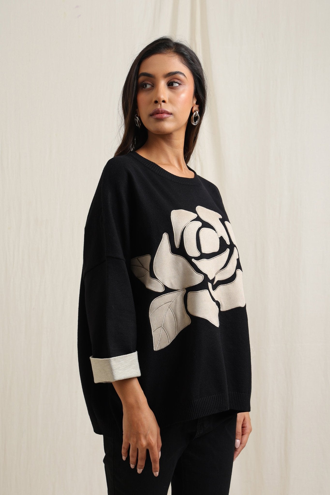Regular price Rs. 6,500This sweater is defined by its prominent rose motif knitted into the front, delivering a timeless yet bold aesthetic. The floral design adds visual interest, while the relaxed fit ensures comfort