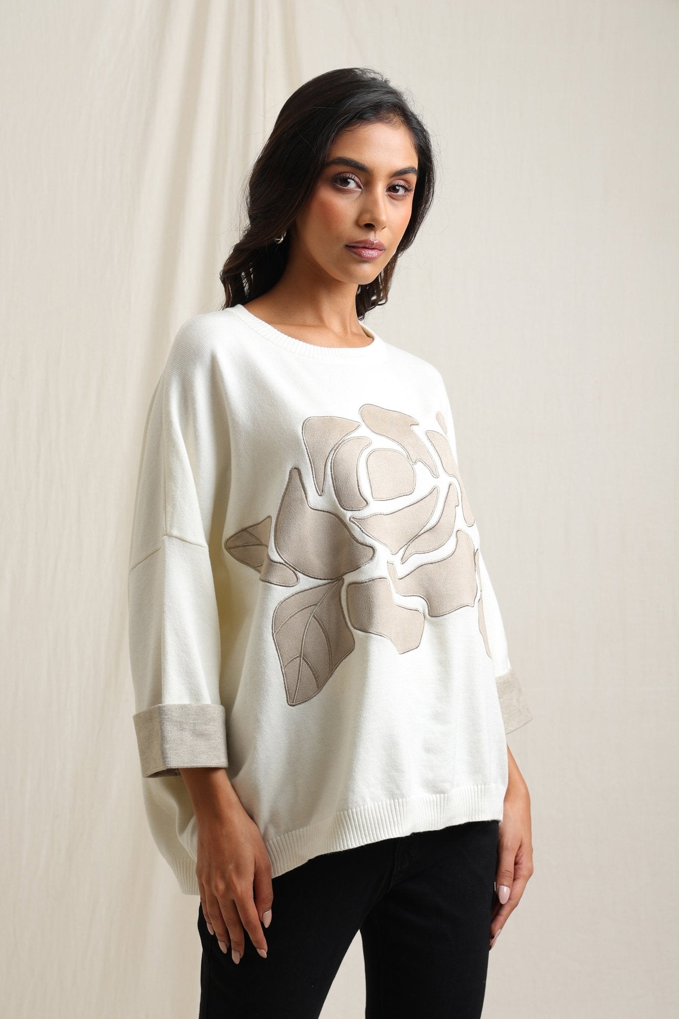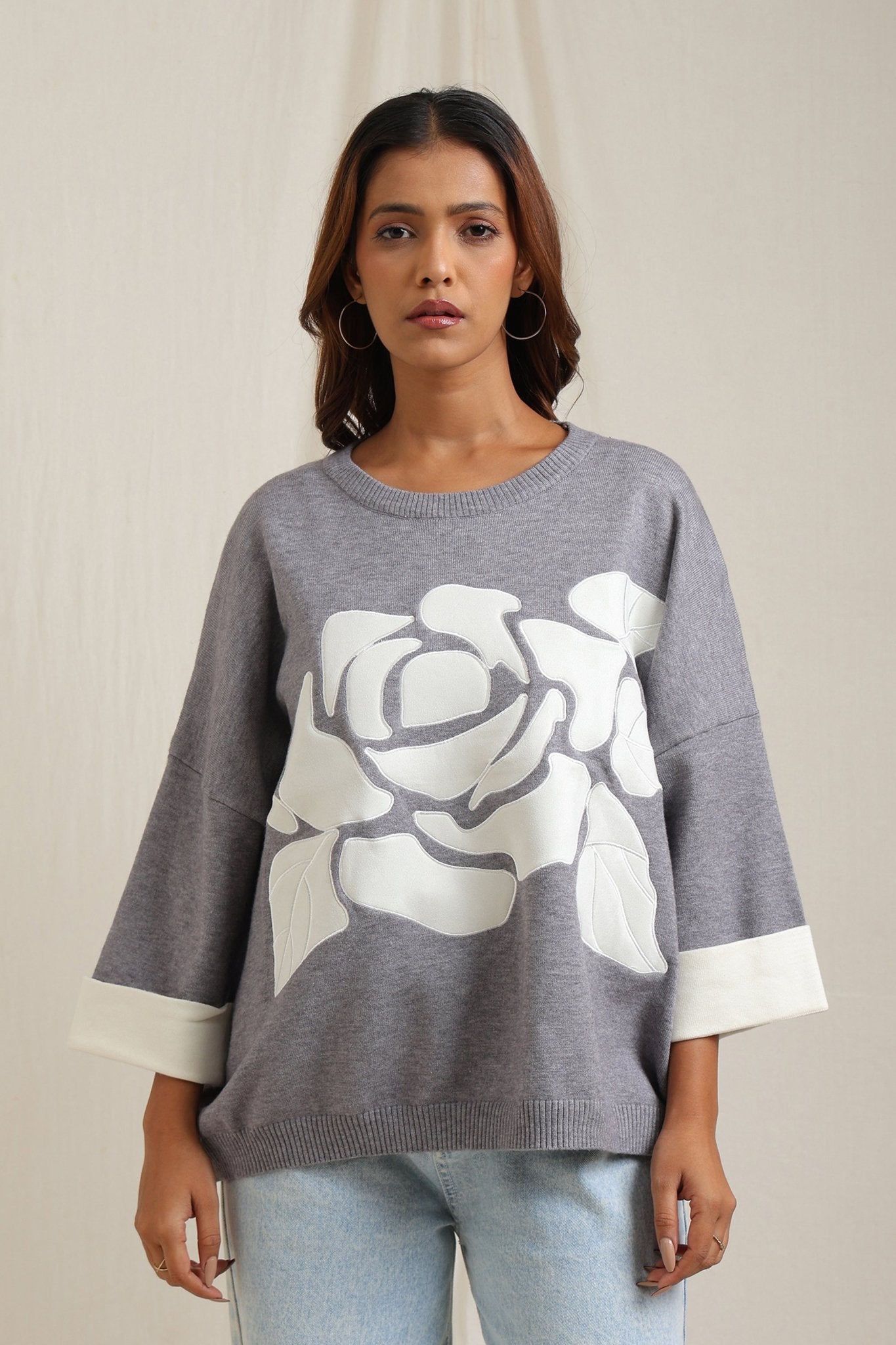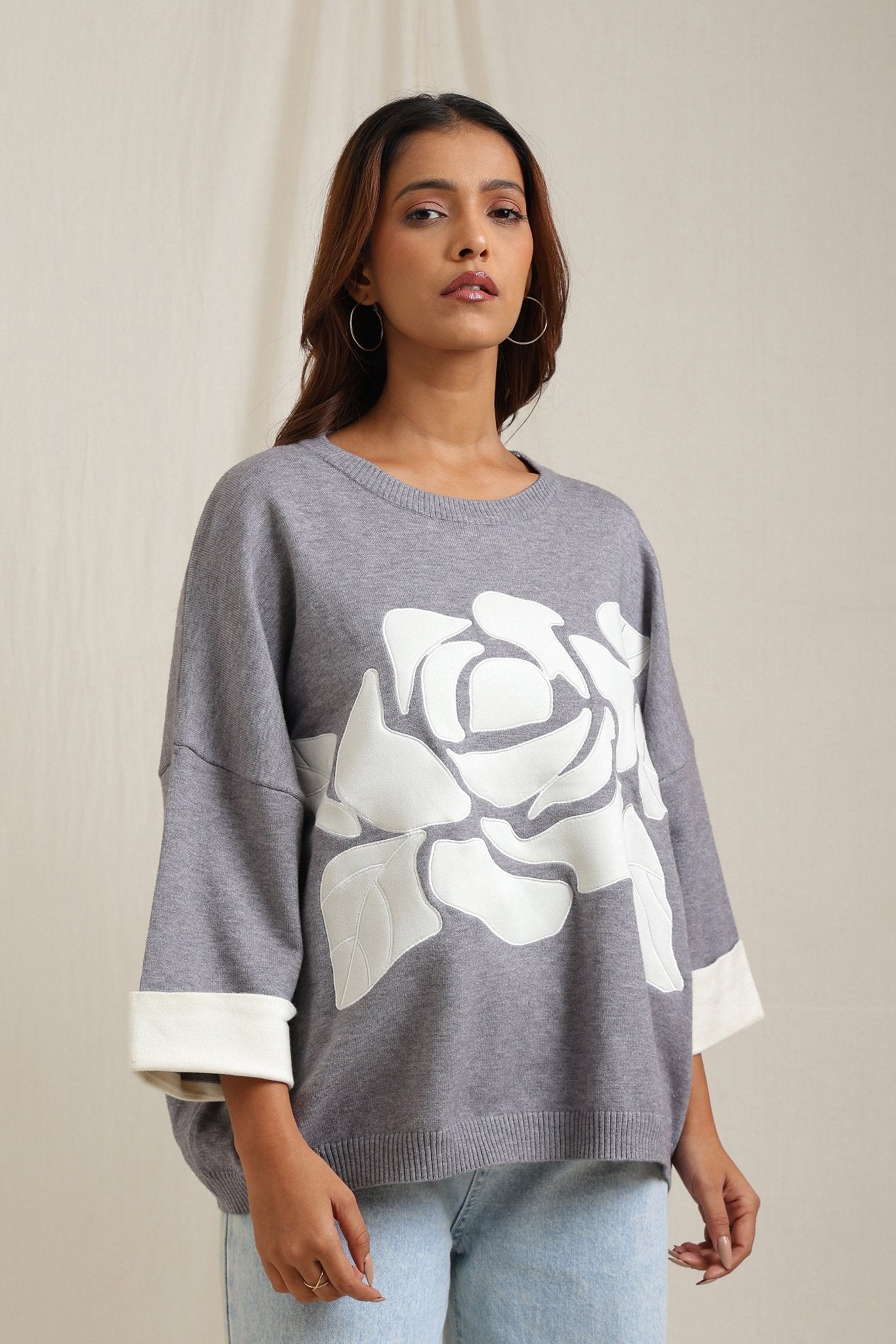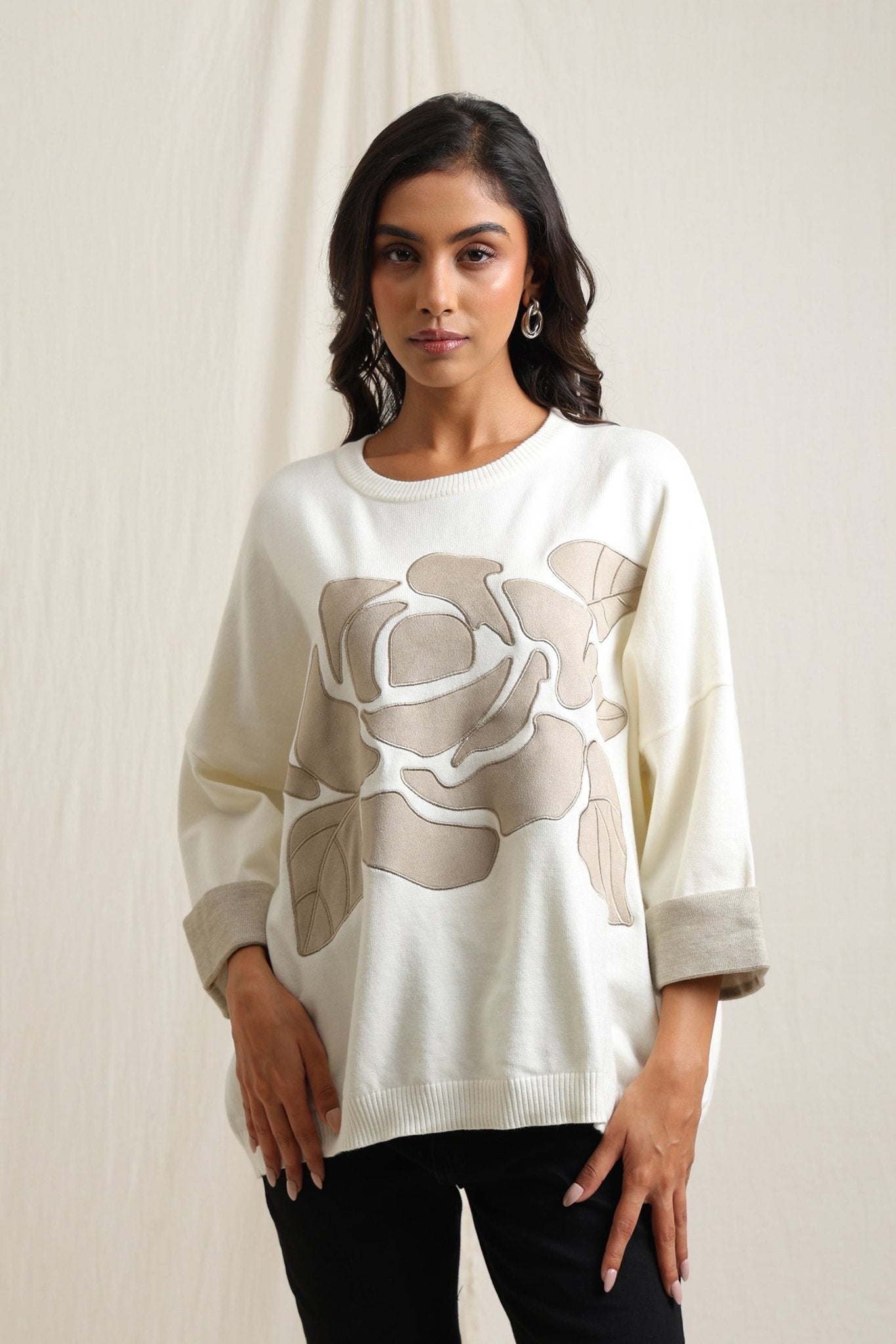 Regular price Rs. 6,500This sweater is defined by its prominent rose motif knitted into the front, delivering a timeless yet bold aesthetic. The floral design adds visual interest, while the relaxed fit ensures comfort