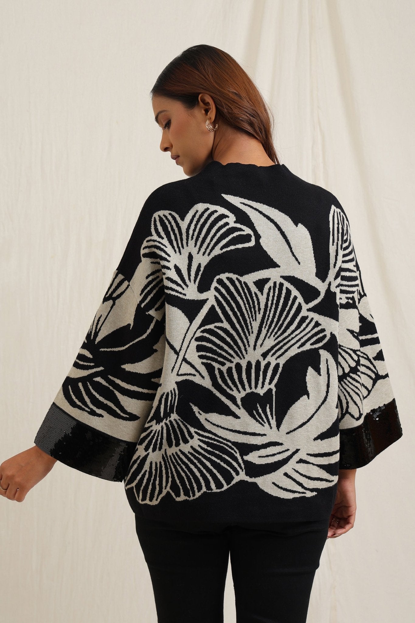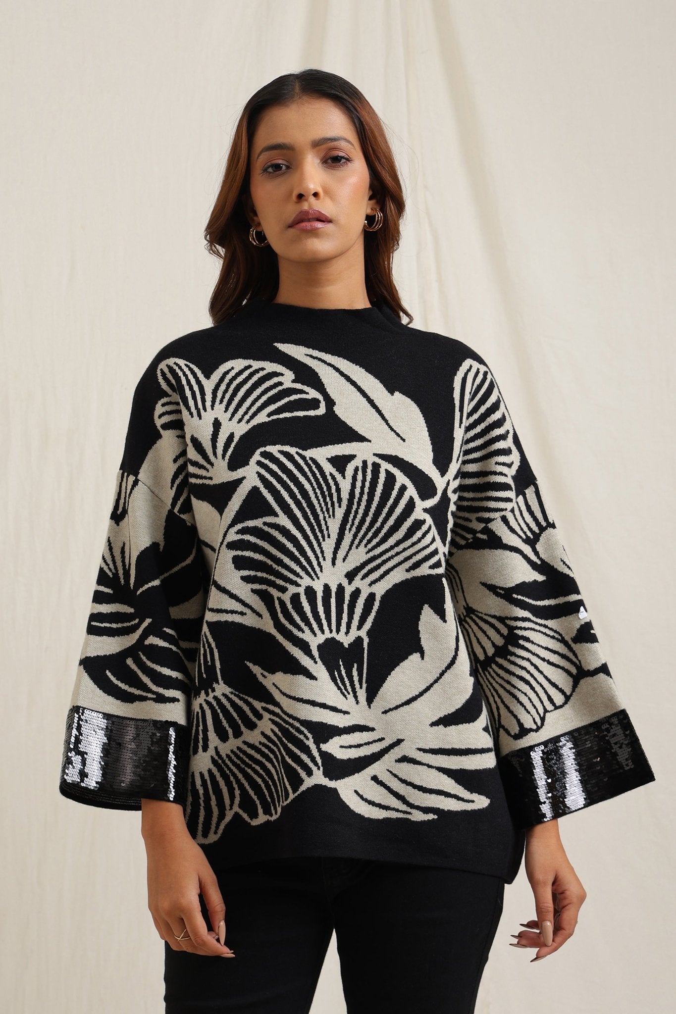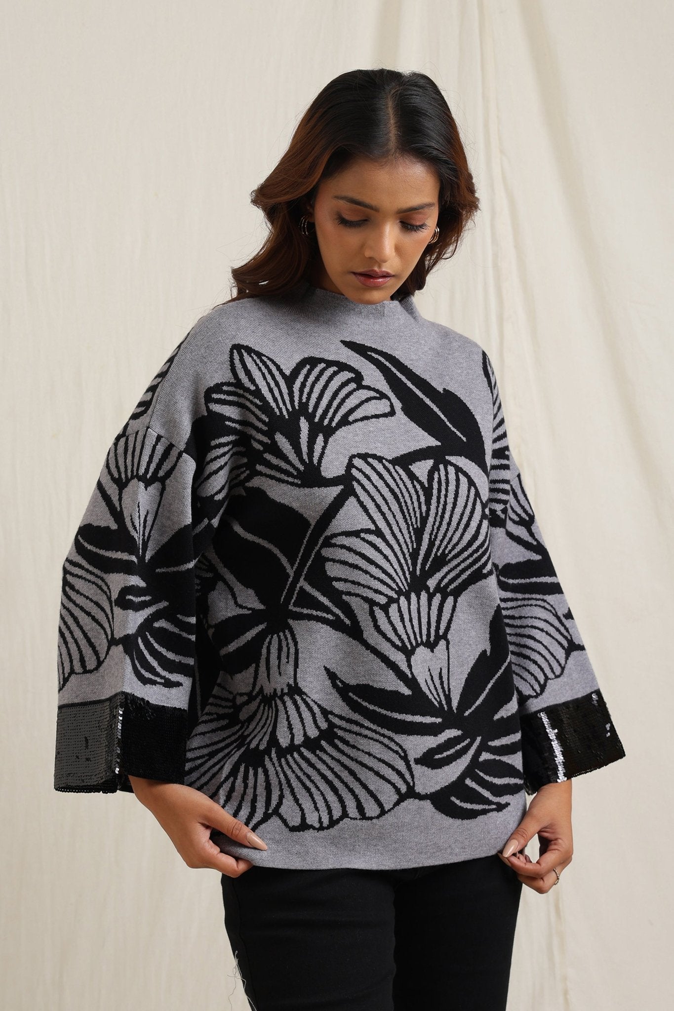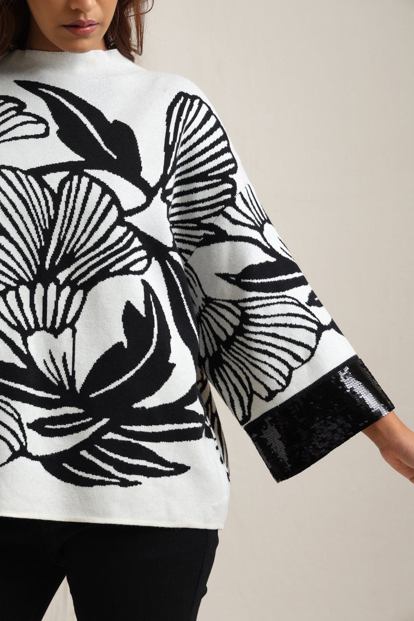 Regular price Rs. 5,600This knitted sweater combines cozy comfort with artistic detailing through its bold floral jacquard pattern. The slightly relaxed fit and structured neckline make it versatile for everyday wear, while the intricate design lends a unique, expressive look