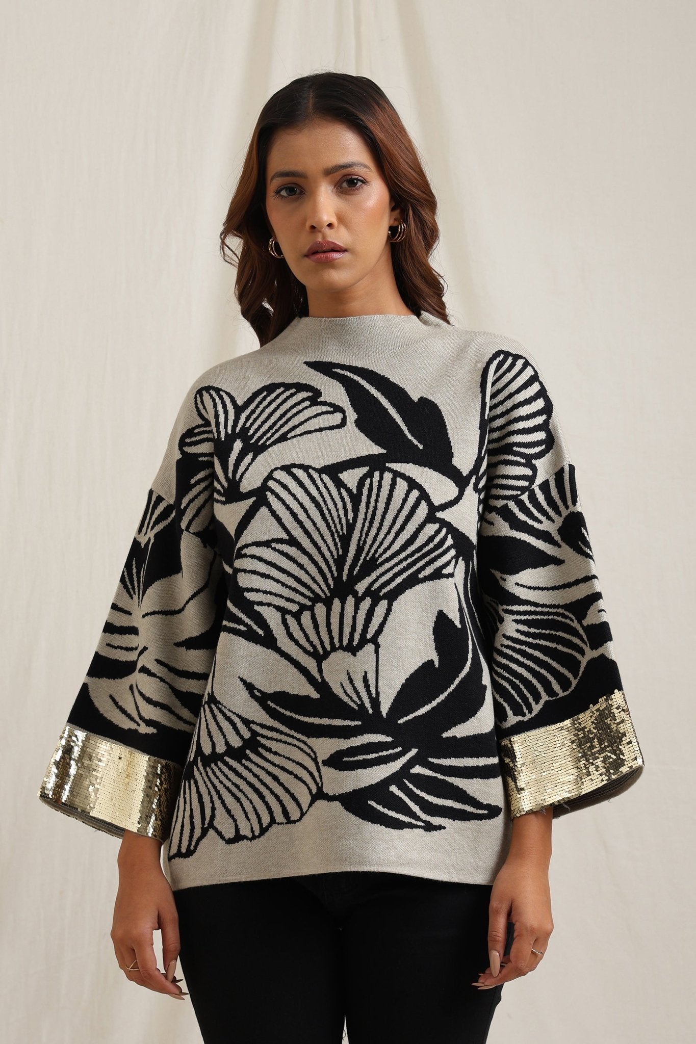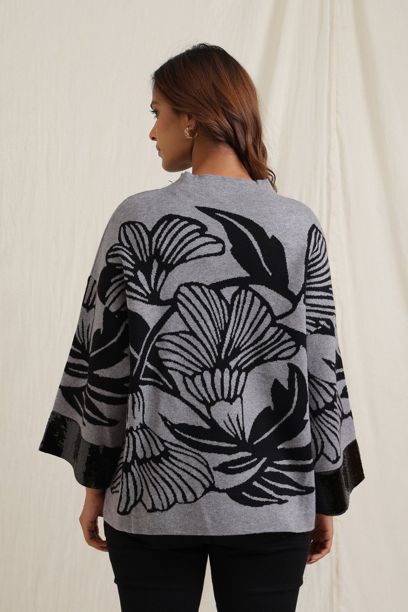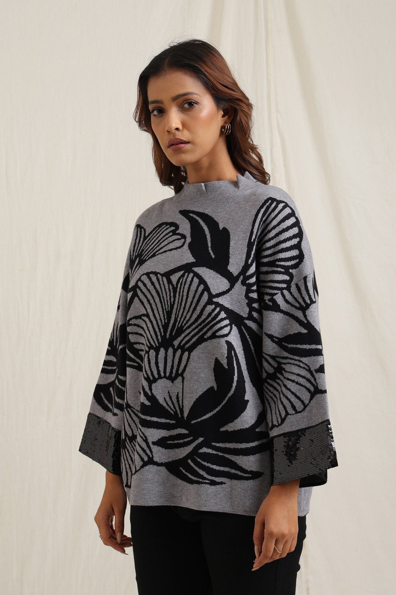 Regular price Rs. 5,600This knitted sweater combines cozy comfort with artistic detailing through its bold floral jacquard pattern. The slightly relaxed fit and structured neckline make it versatile for everyday wear, while the intricate design lends a unique, expressive look