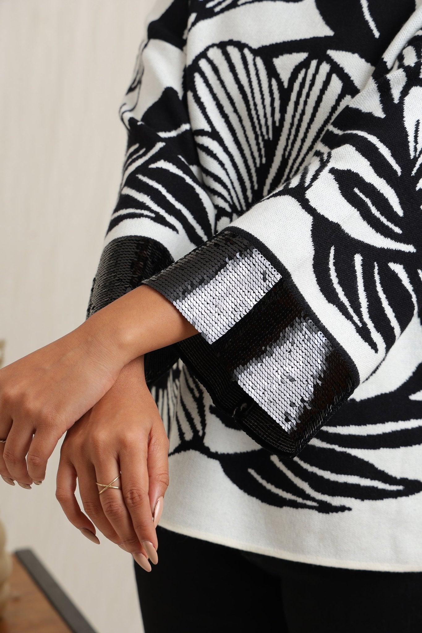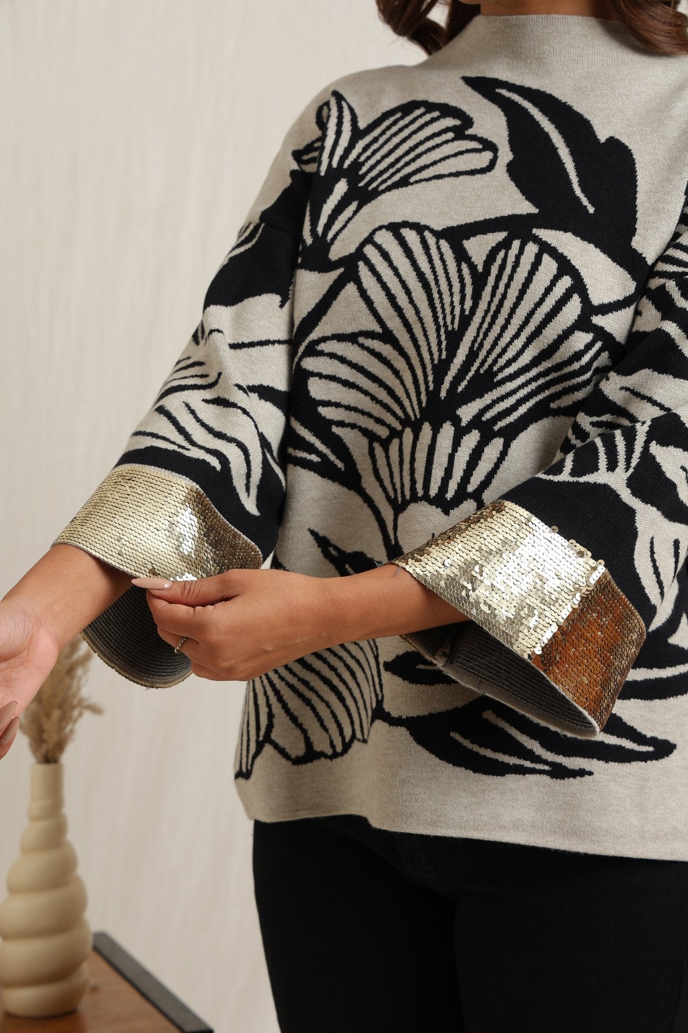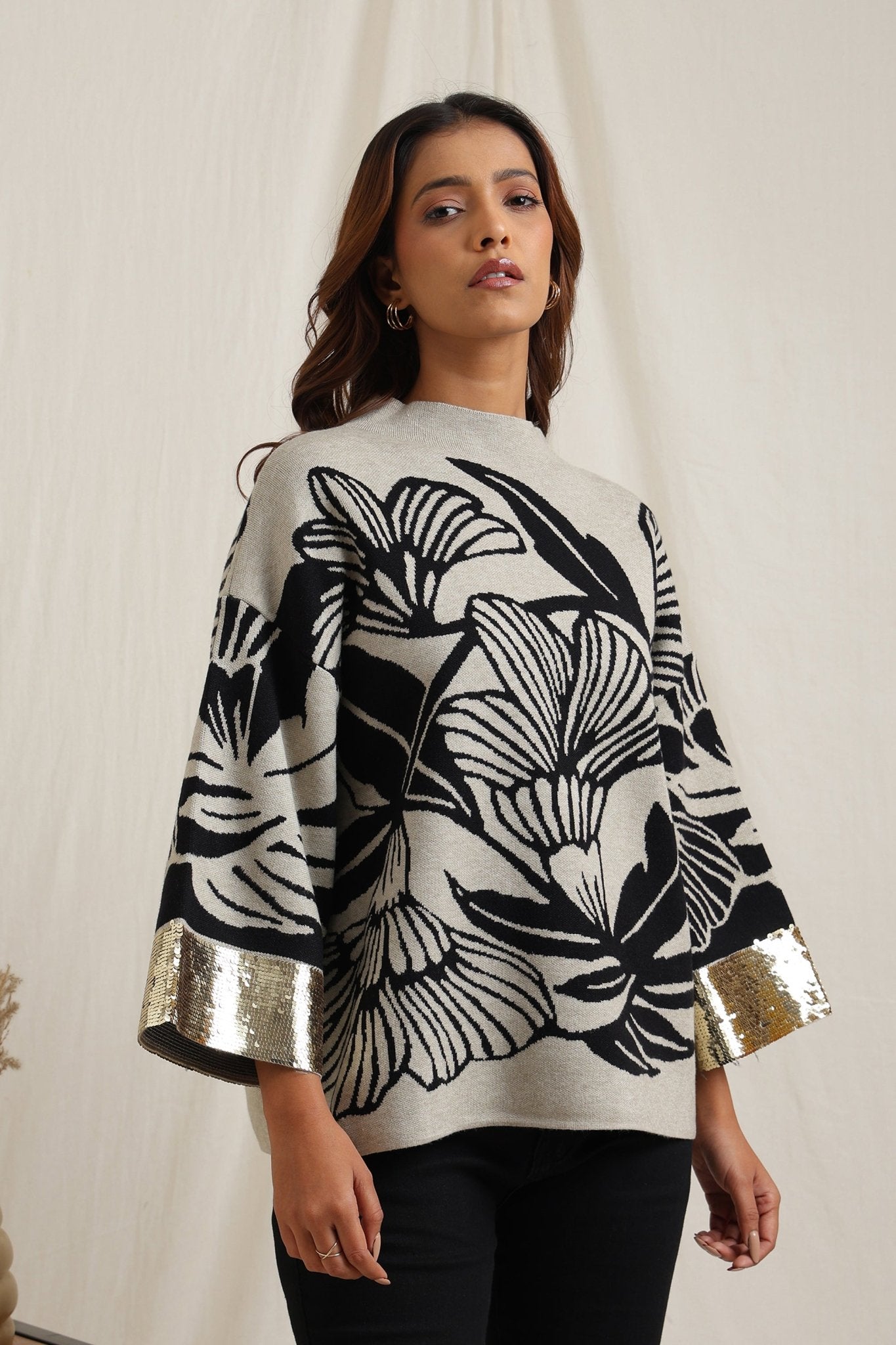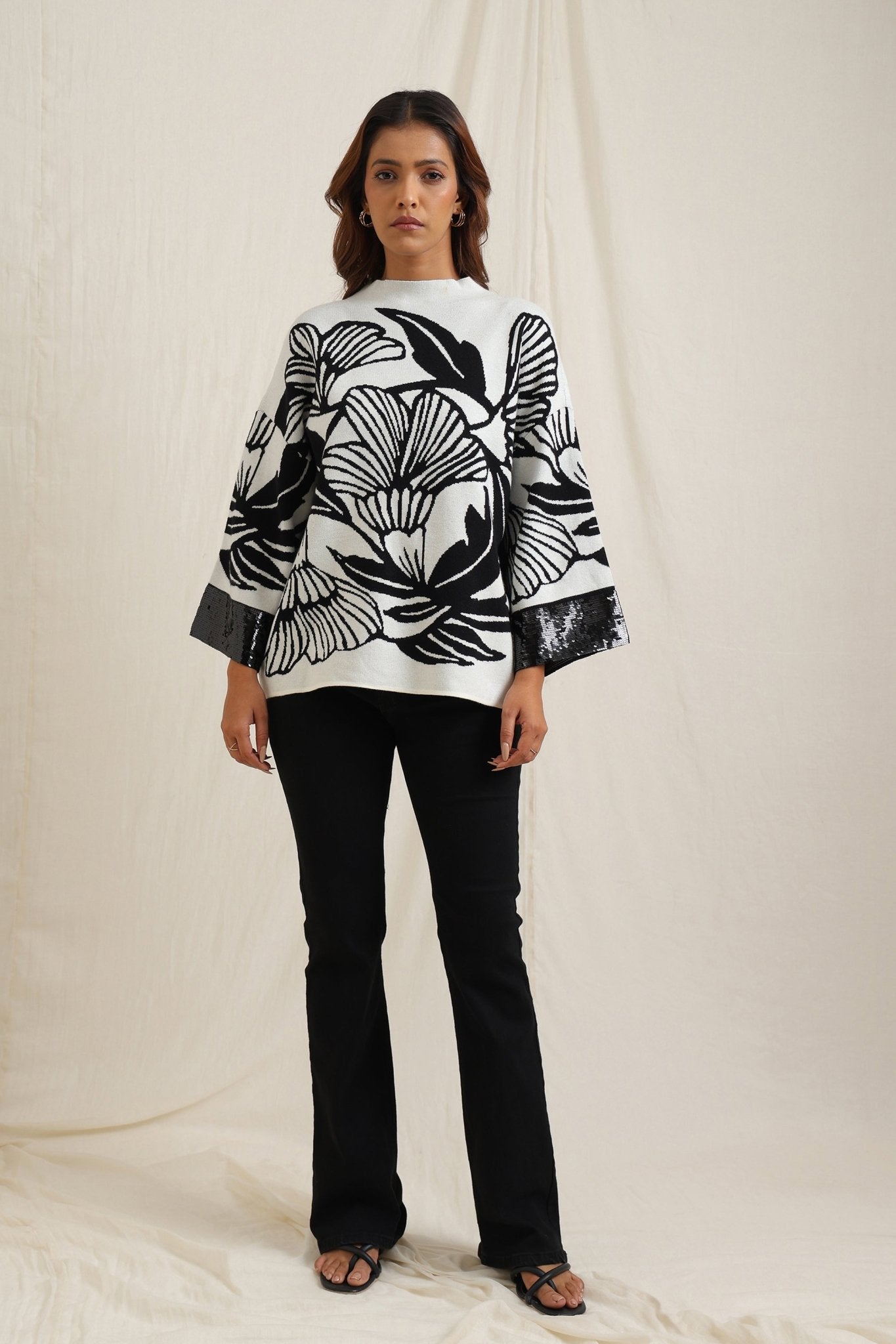 Regular price Rs. 5,600This knitted sweater combines cozy comfort with artistic detailing through its bold floral jacquard pattern. The slightly relaxed fit and structured neckline make it versatile for everyday wear, while the intricate design lends a unique, expressive look