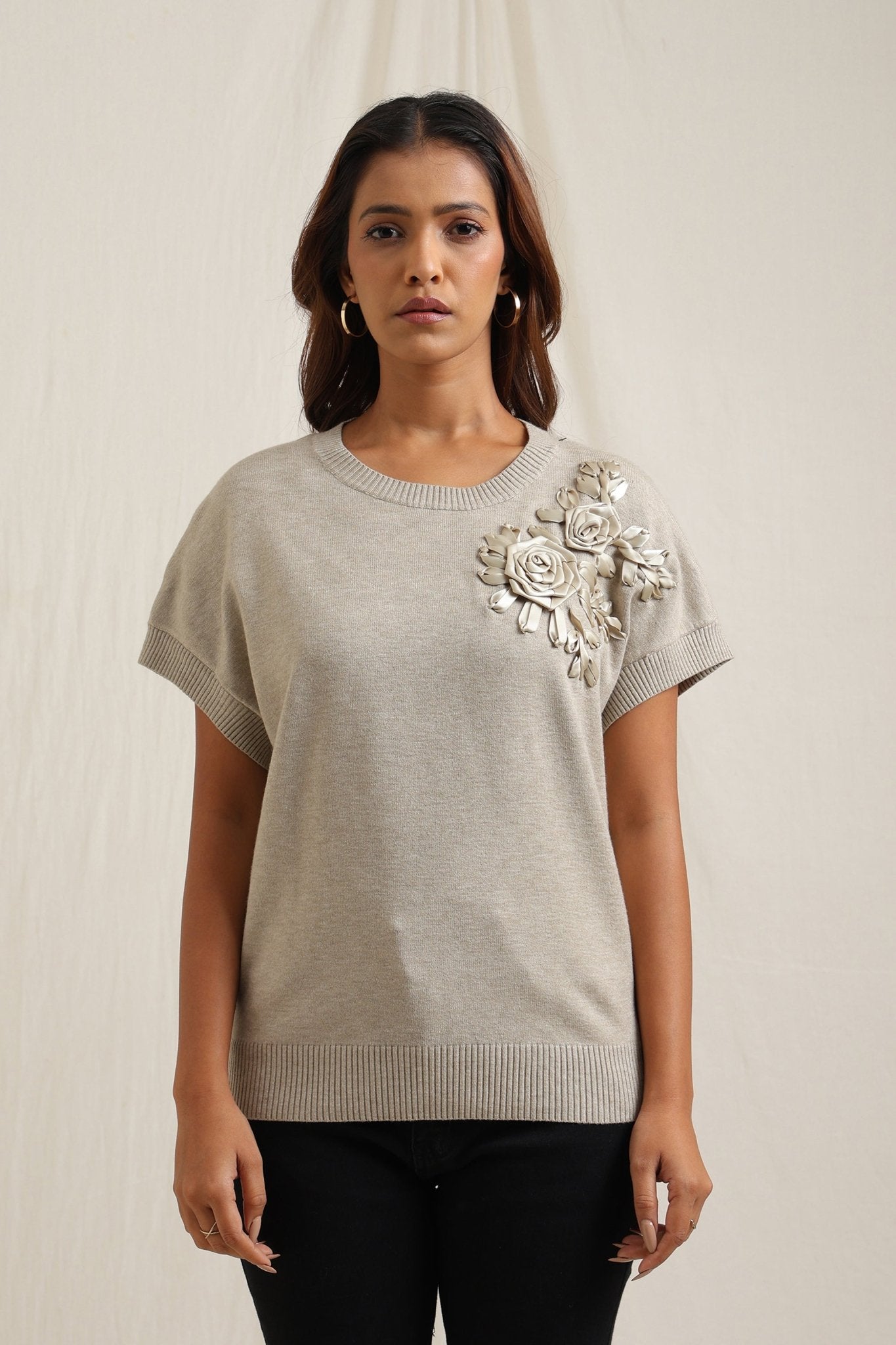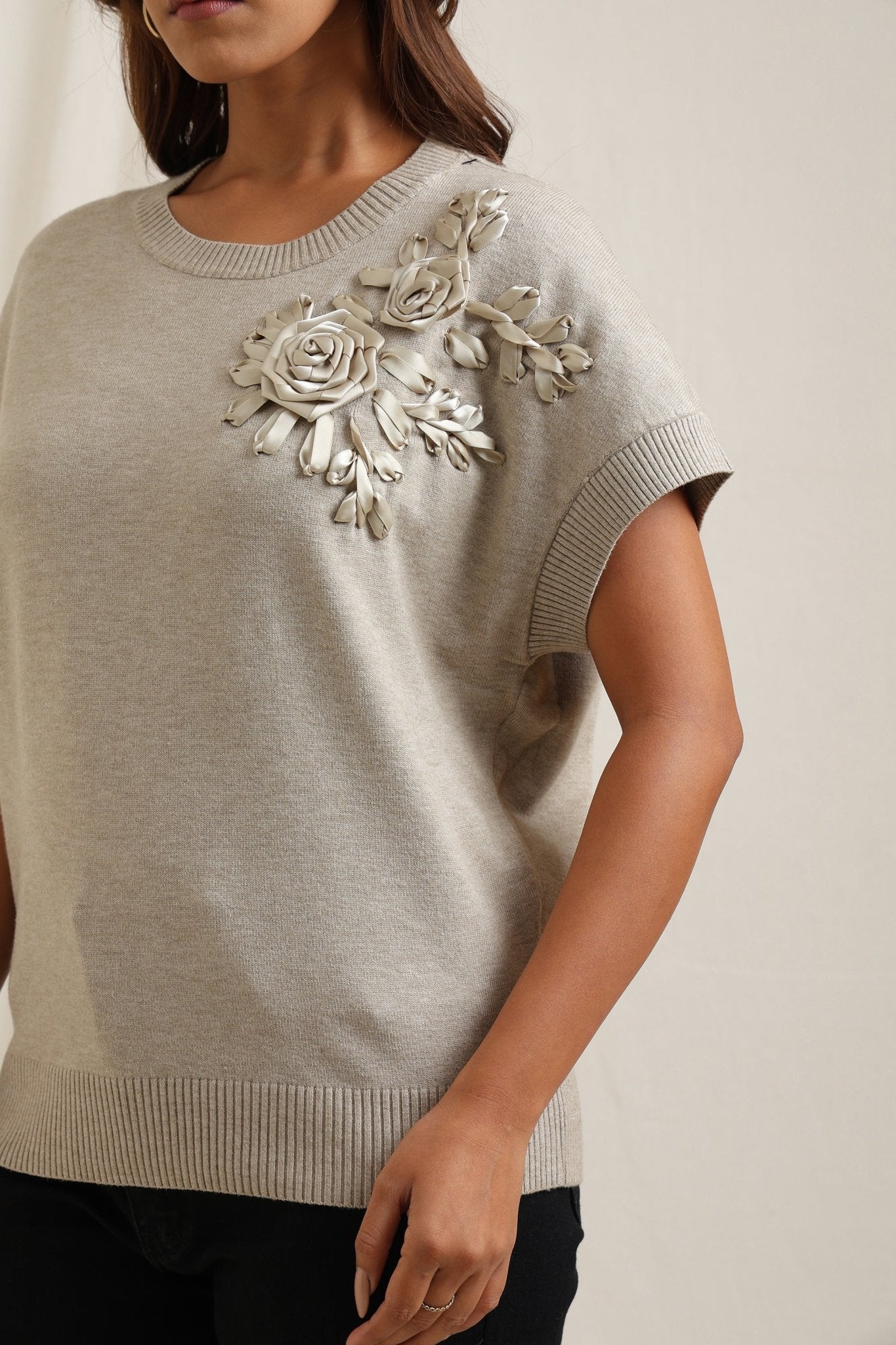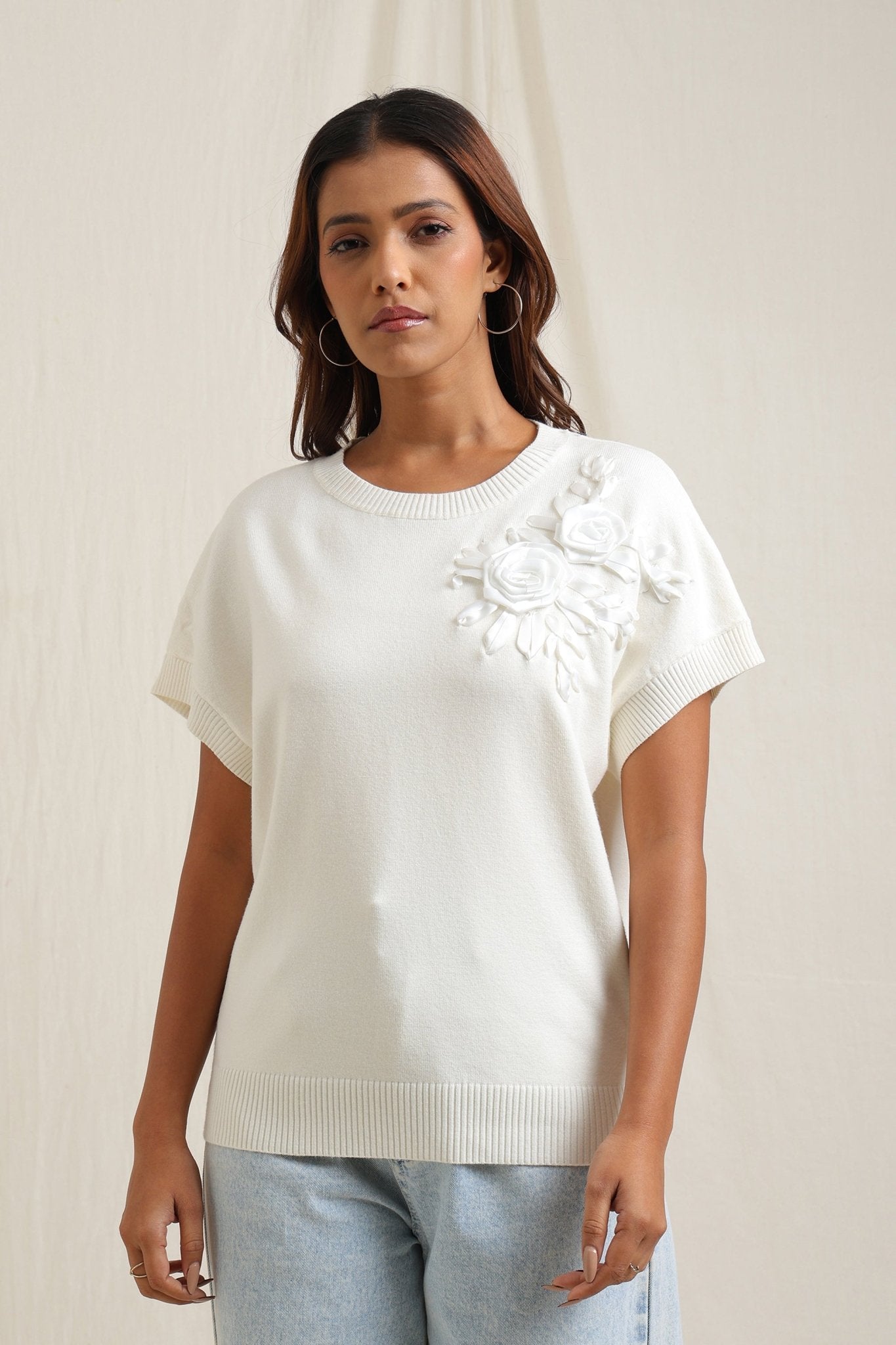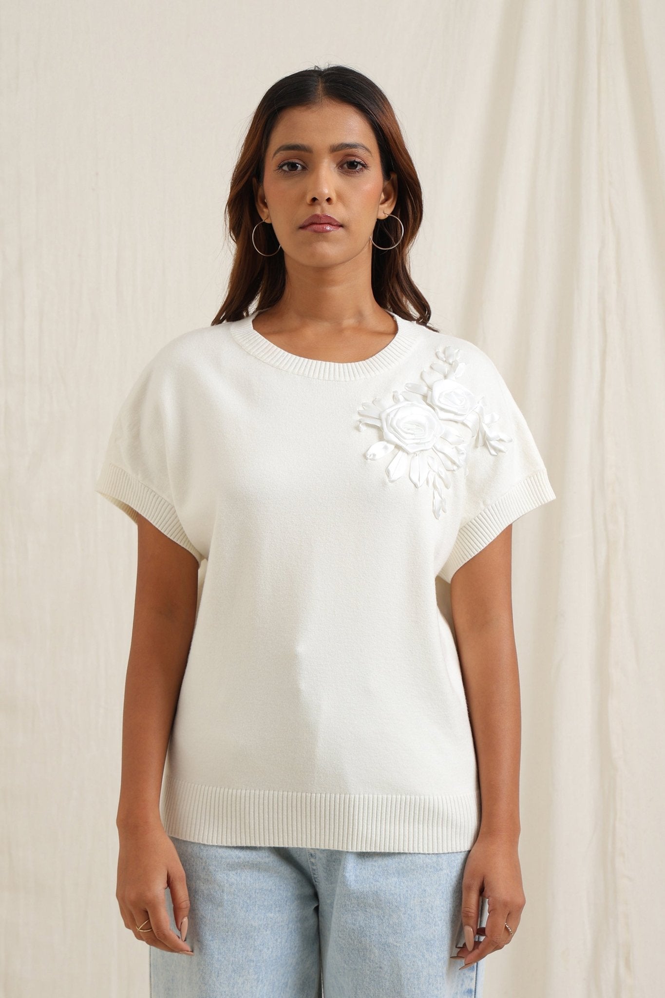 Sweater With Tonal Floral Embroidery