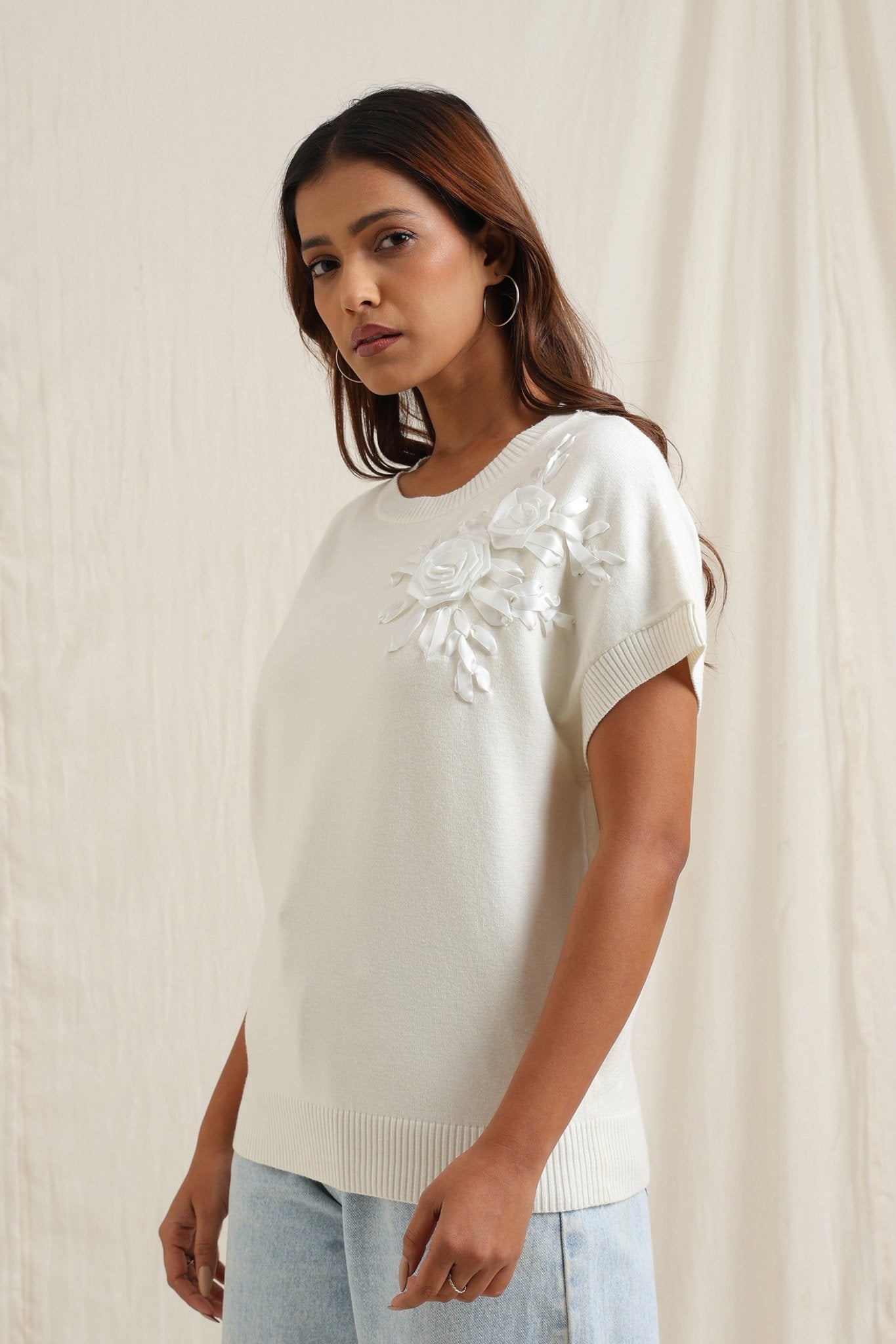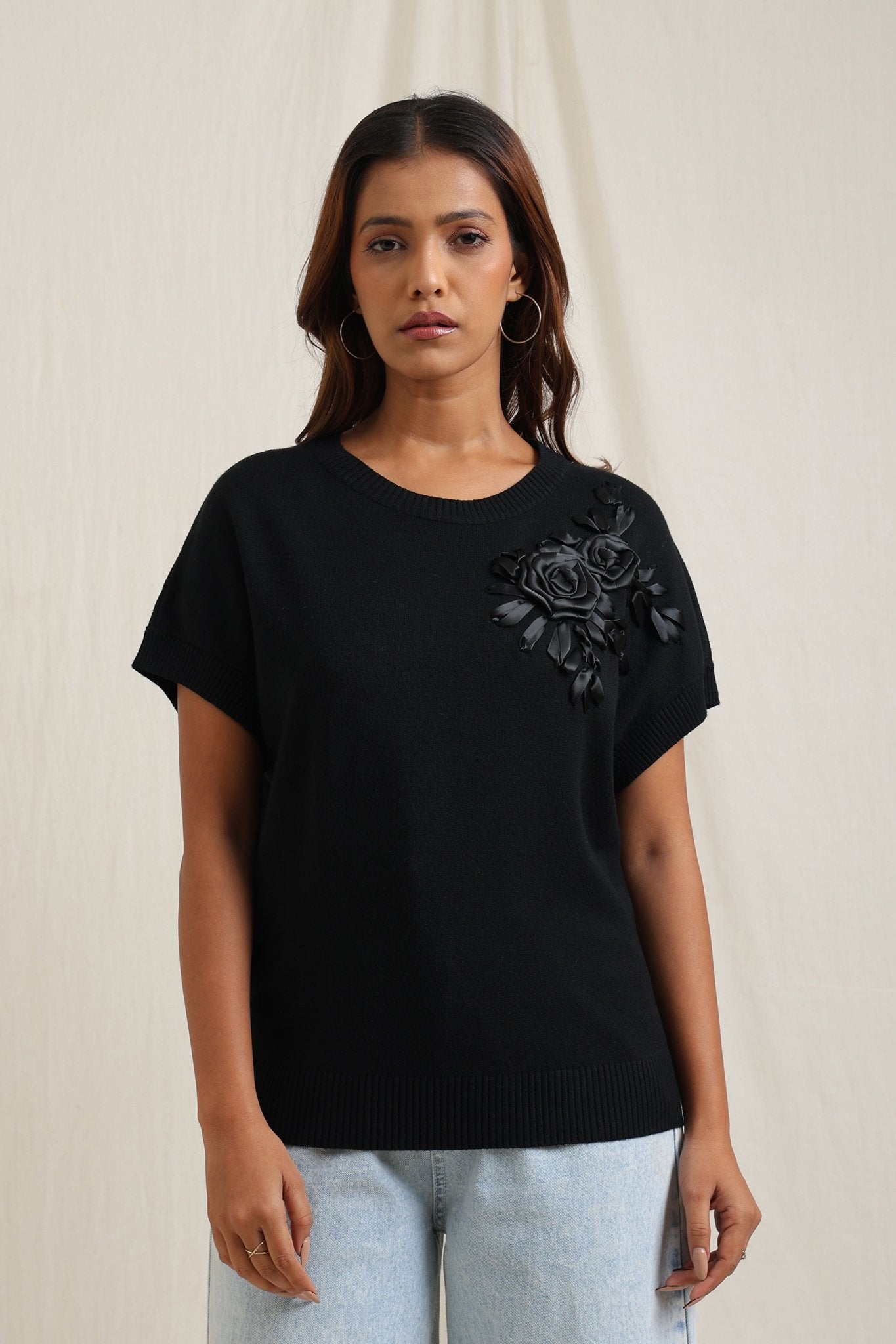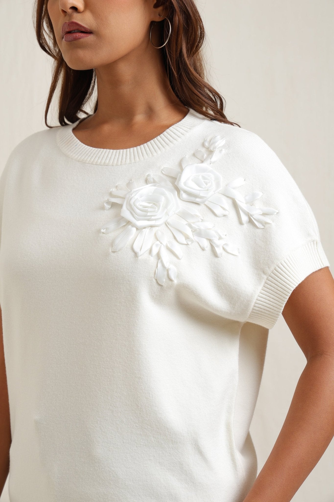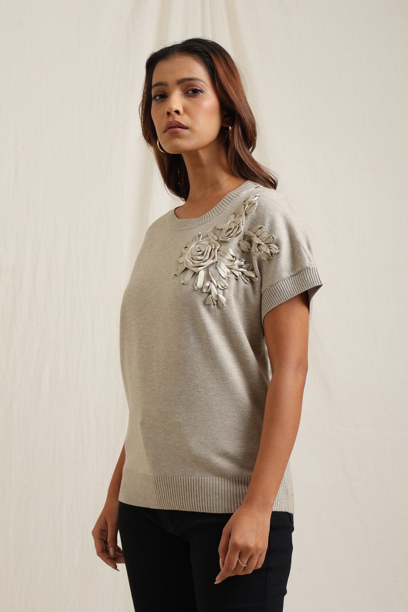 Sweater With Tonal Floral Embroidery