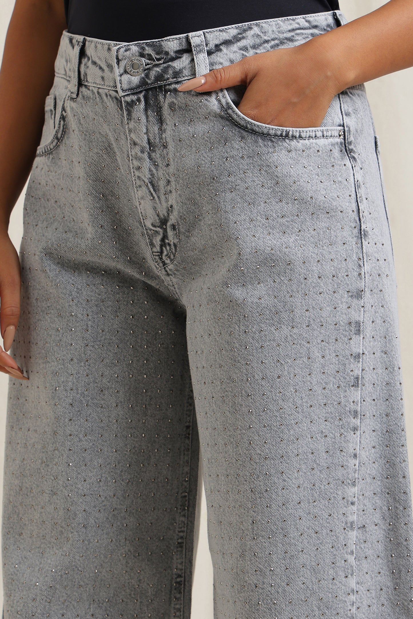 Wide-leg studded jeans crafted from soft, breathable cotton for all-day comfort.