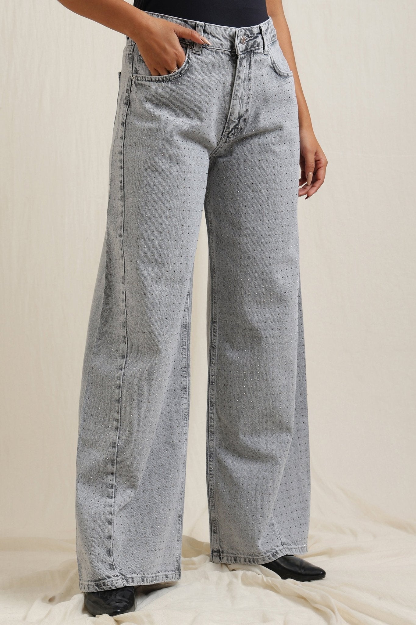Wide-leg studded jeans crafted from soft, breathable cotton for all-day comfort.