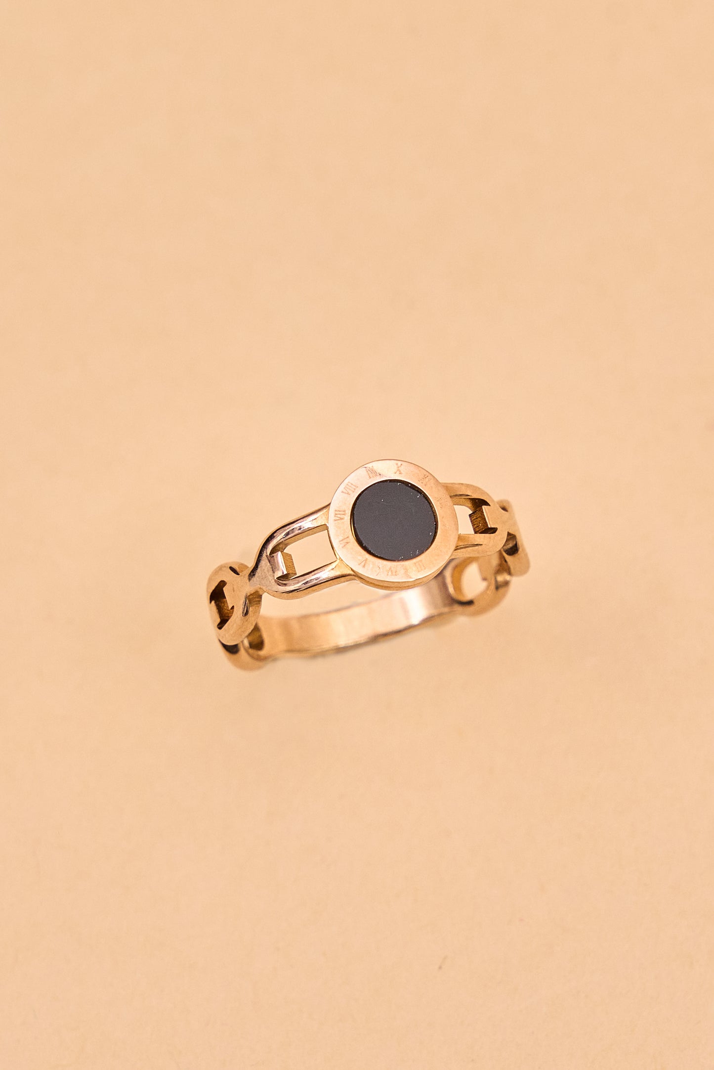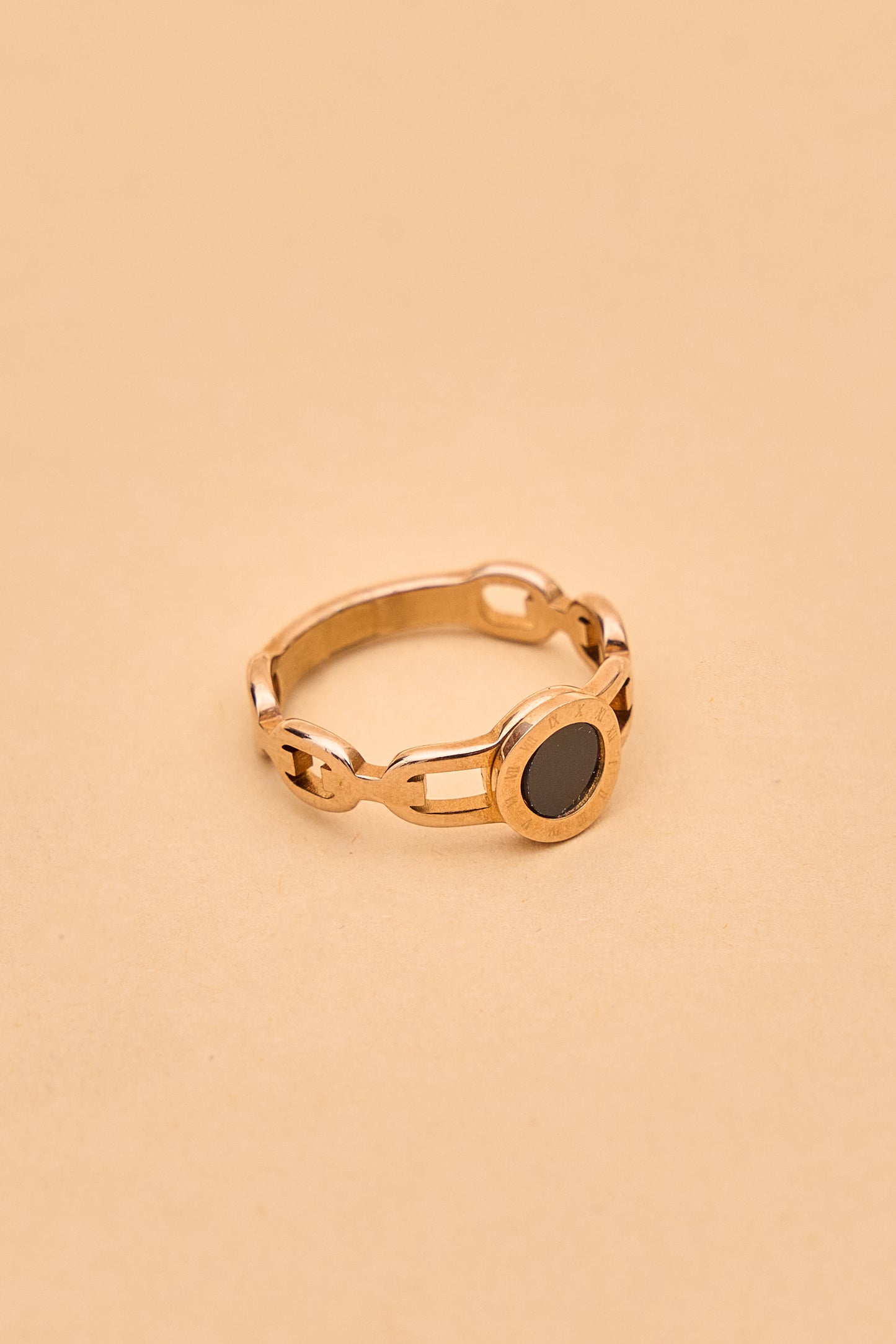 Regular price Rs. 480Bold and contemporary, this gold-tone ring features a striking black enamel center and an open-link band, making a chic statement for modern style lovers.