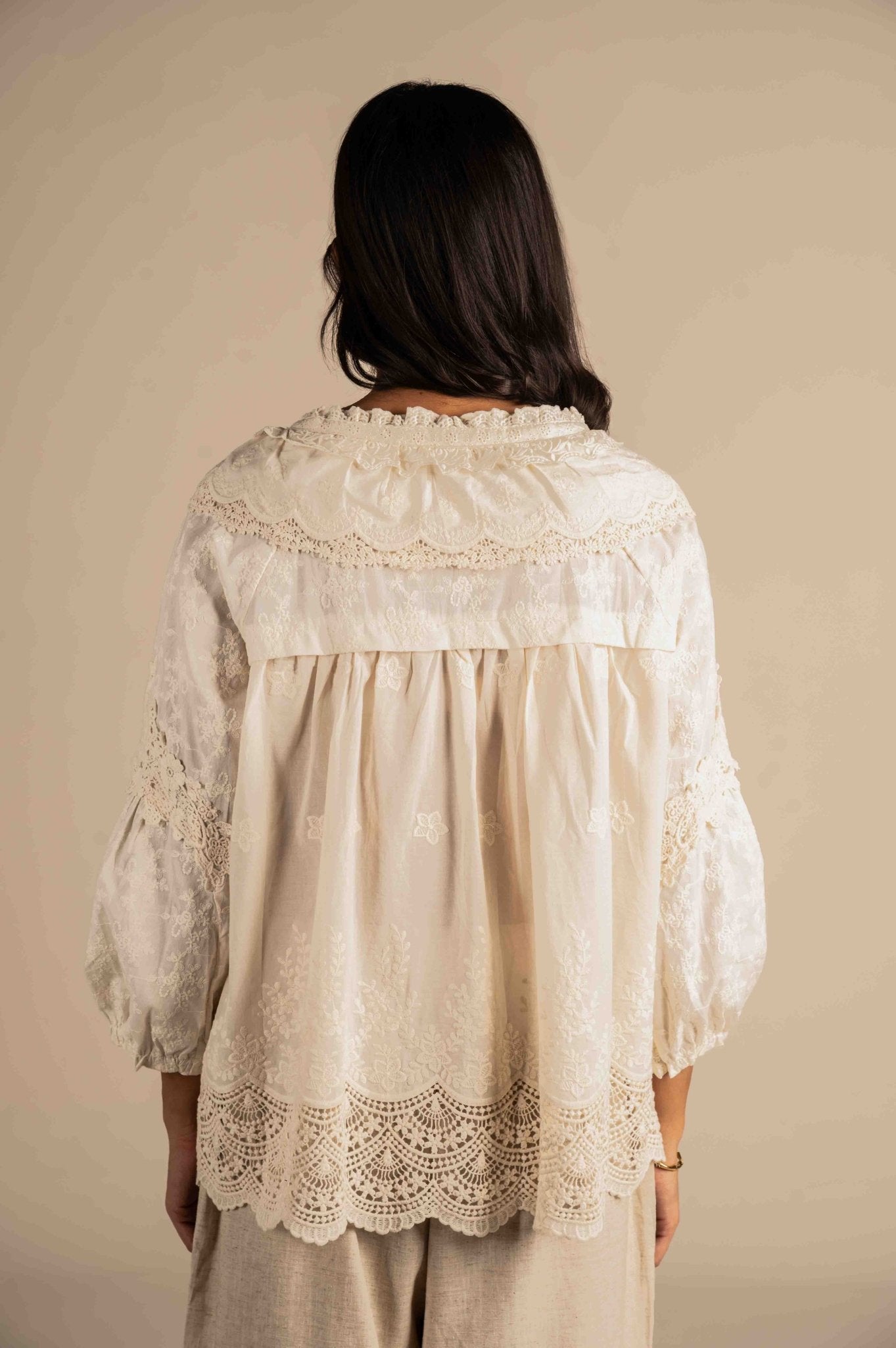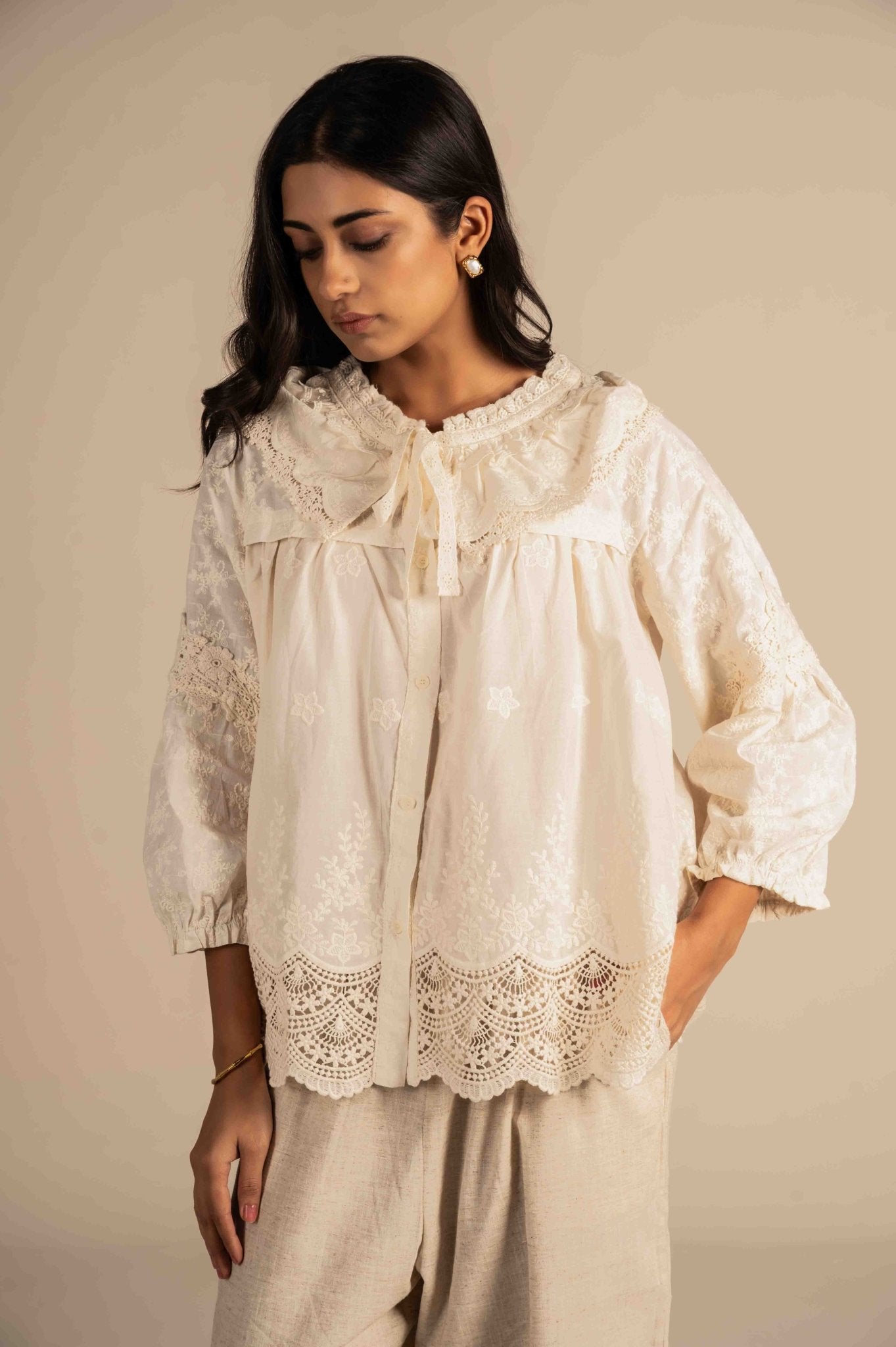 Delicate and charming full-sleeve Peter Pan shirt is adorned with intricate lace detailing for a soft, feminine look. Perfect for adding elegance to any outfit