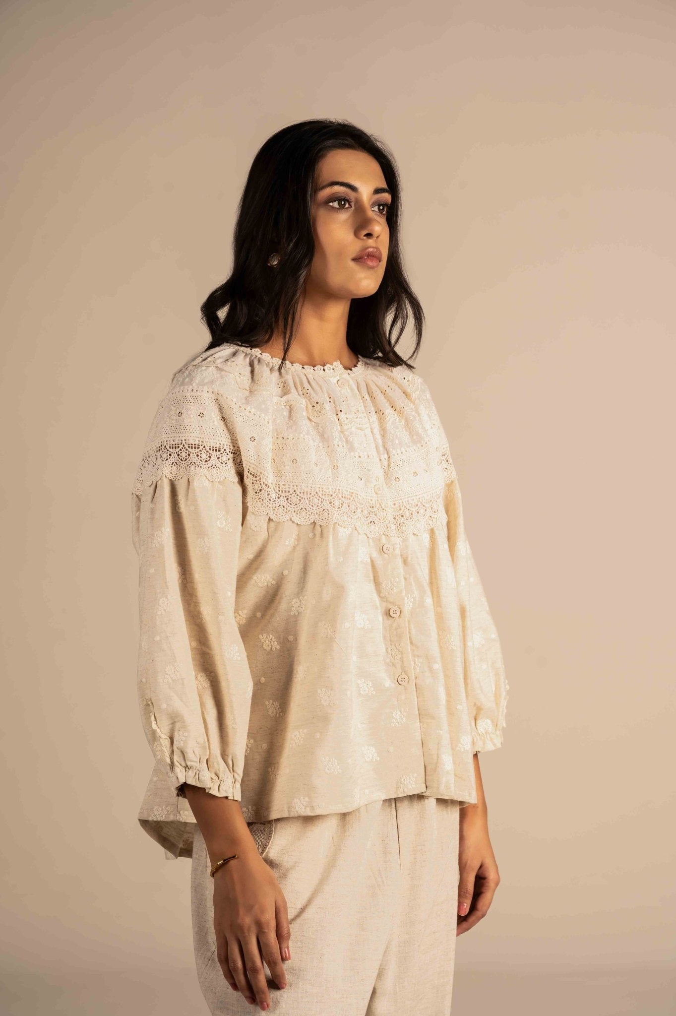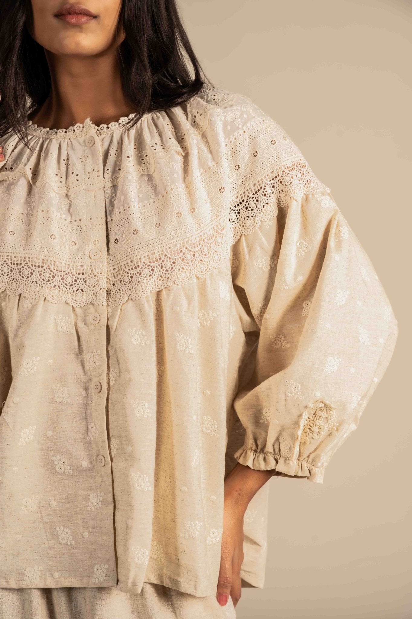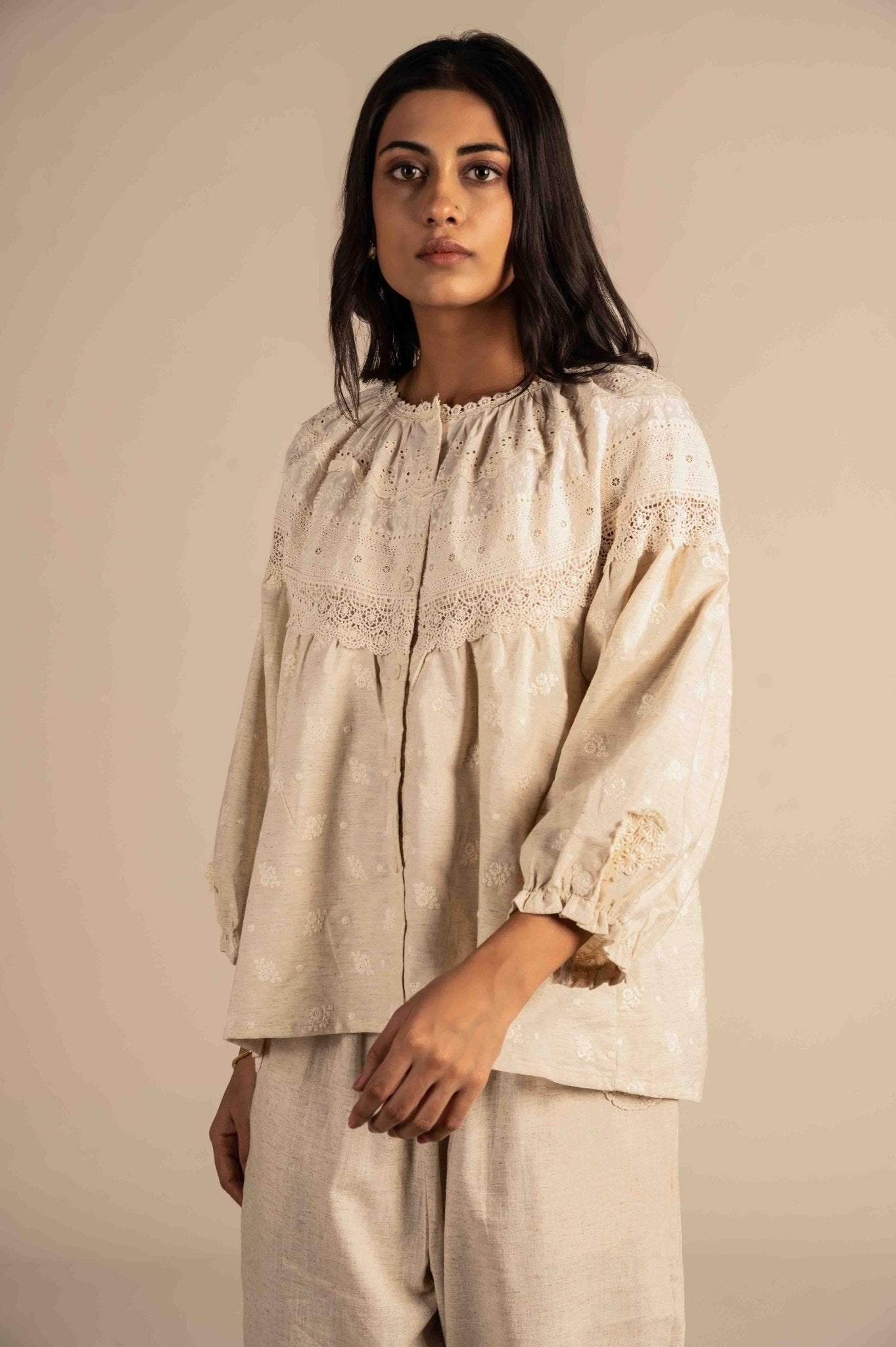 Delicate and elegant full-sleeve shirt is adorned with intricate lace embroidery, adding a soft, sophisticated touch. Perfect for a refined, feminine look.