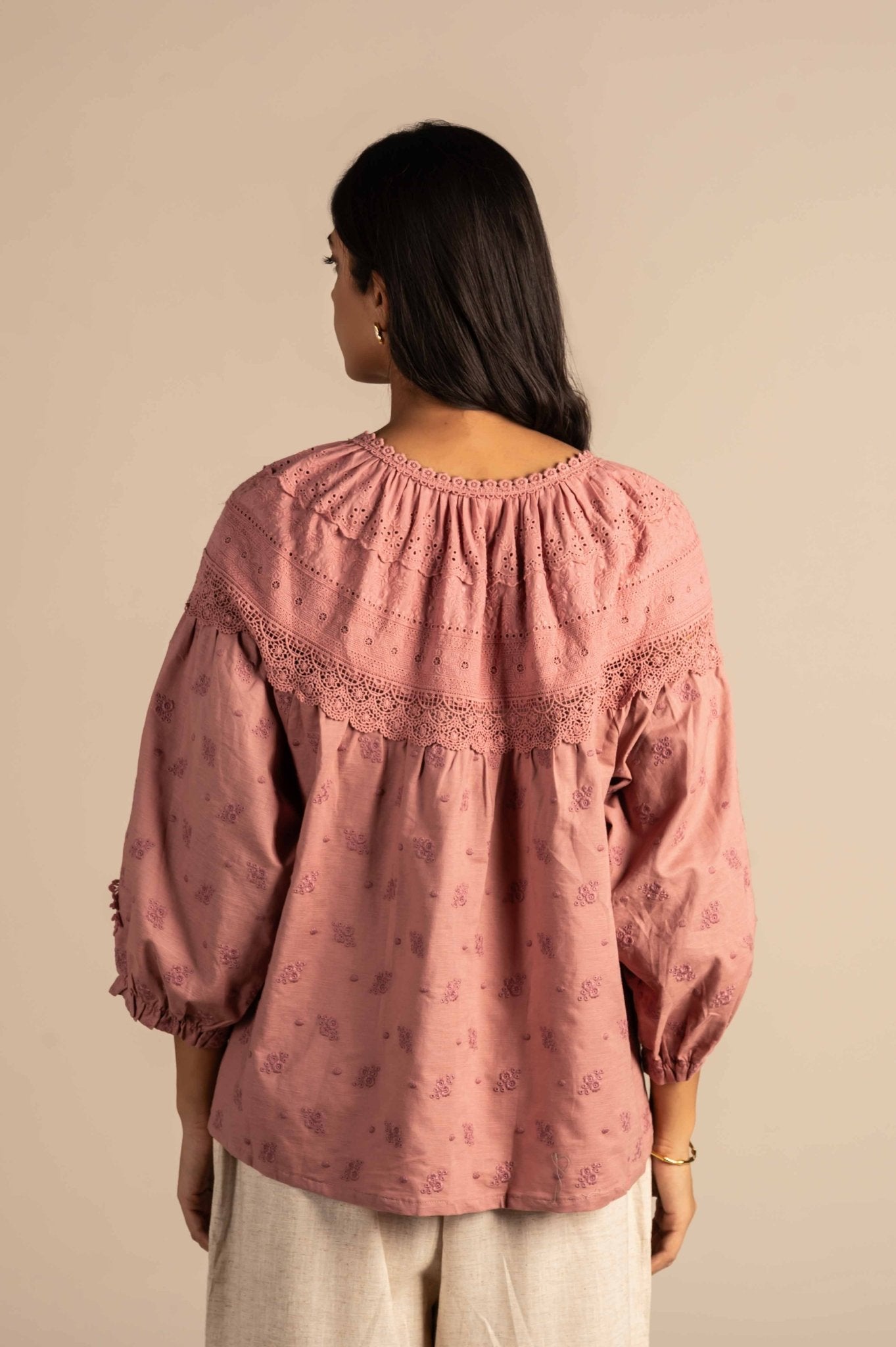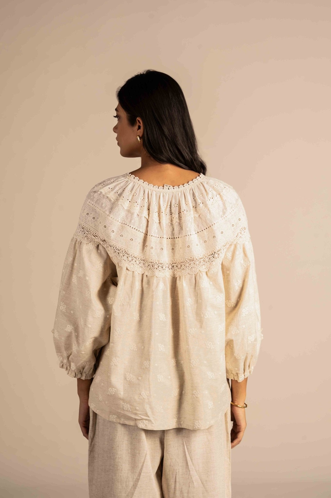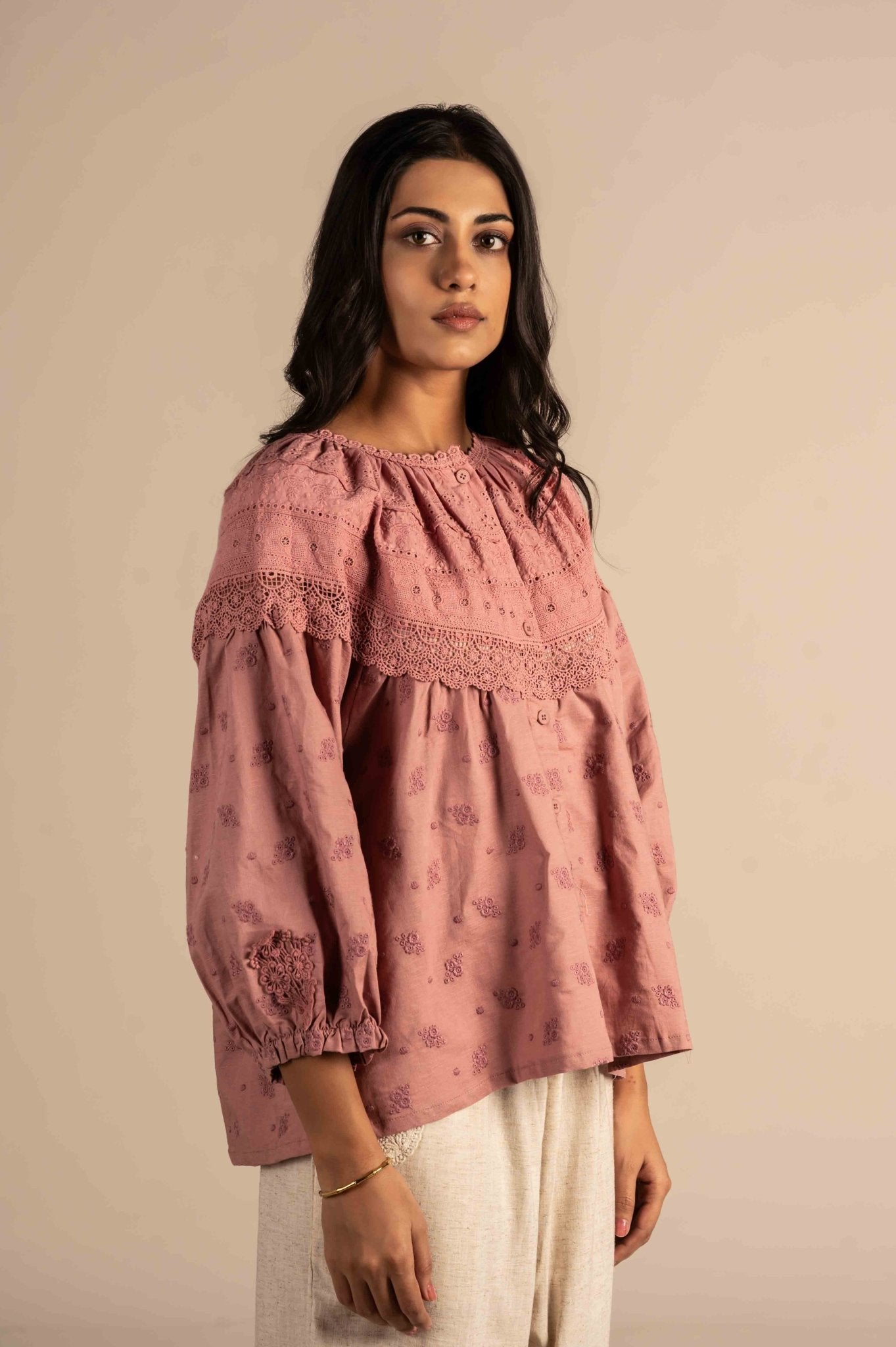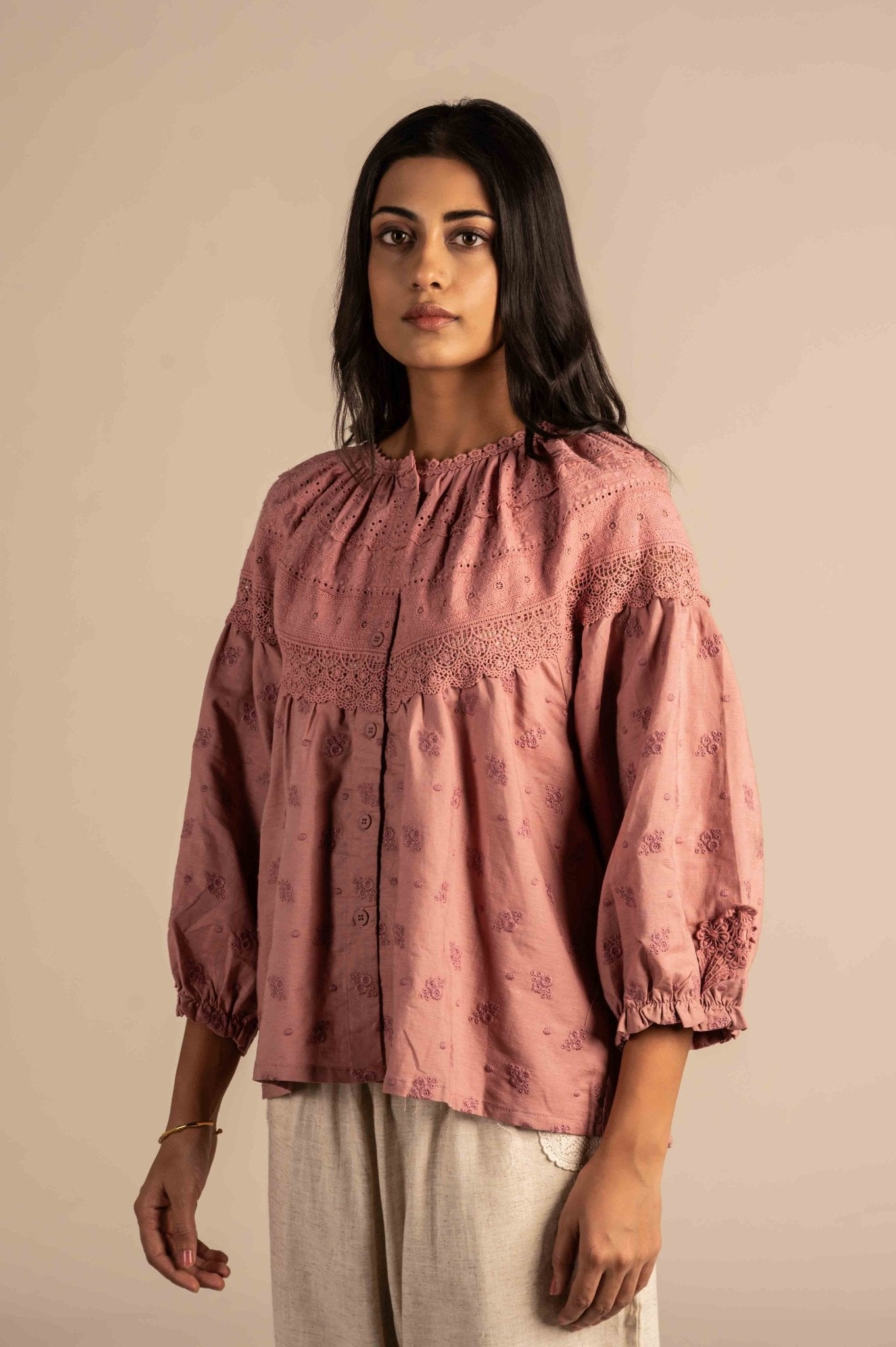 Delicate and elegant full-sleeve shirt is adorned with intricate lace embroidery, adding a soft, sophisticated touch. Perfect for a refined, feminine look.