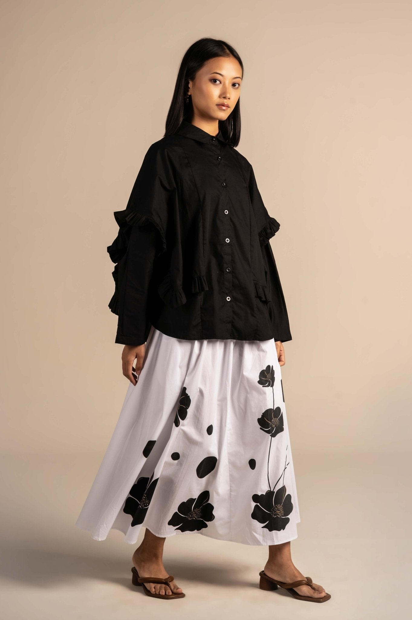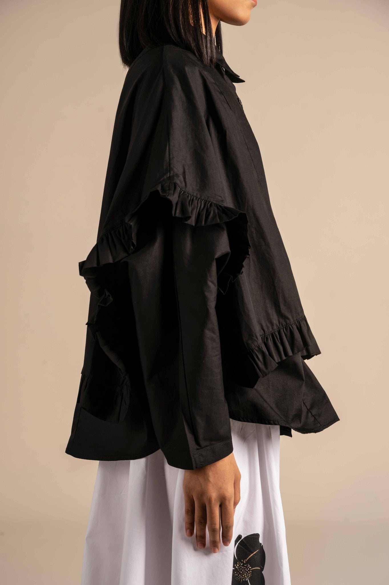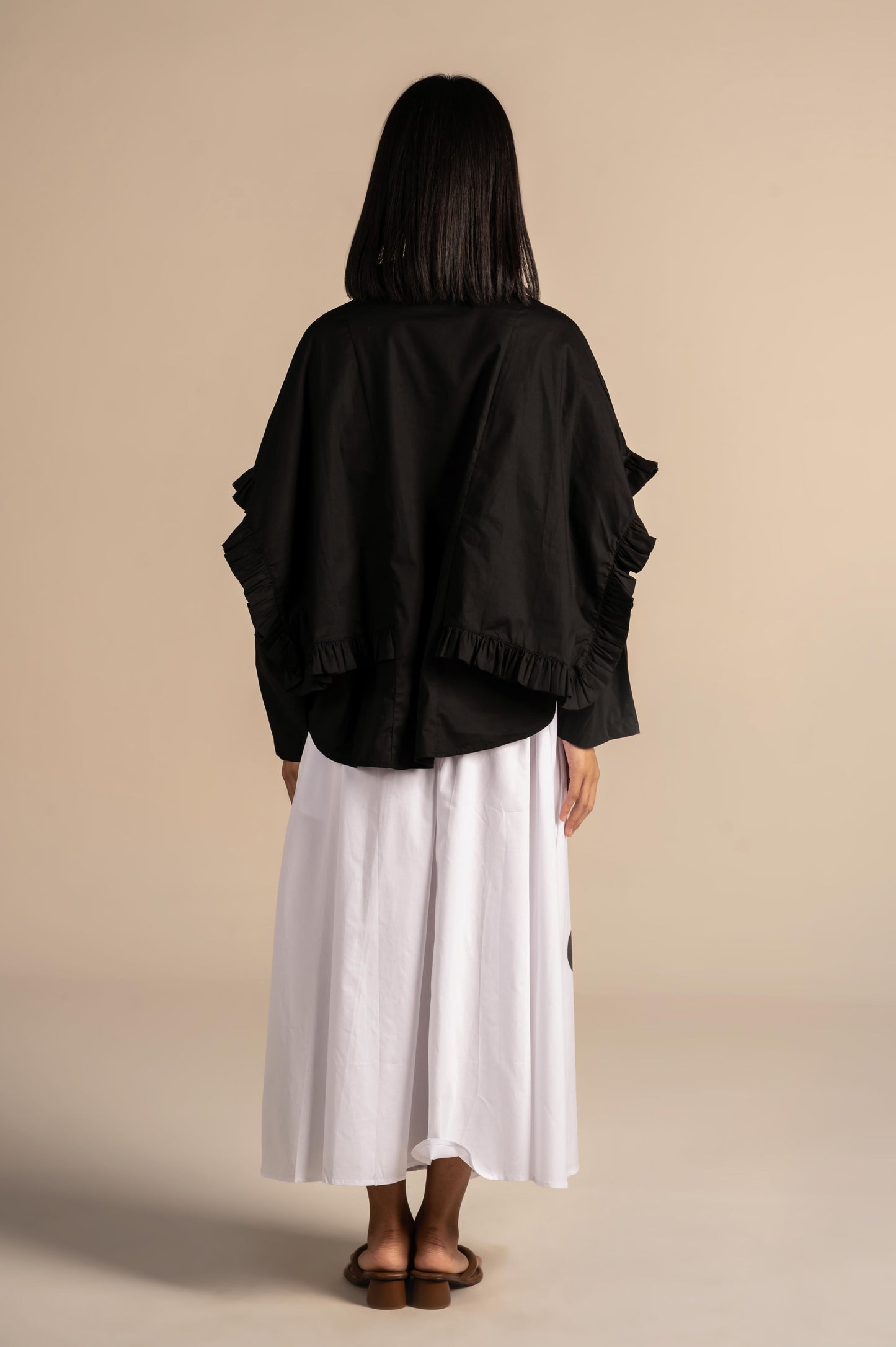 Ruffle shirt features a sharp collar and minimal design, making it a versatile staple for any wardrobe. Ideal for both casual and workwear, it offers effortless style with a polished touch.