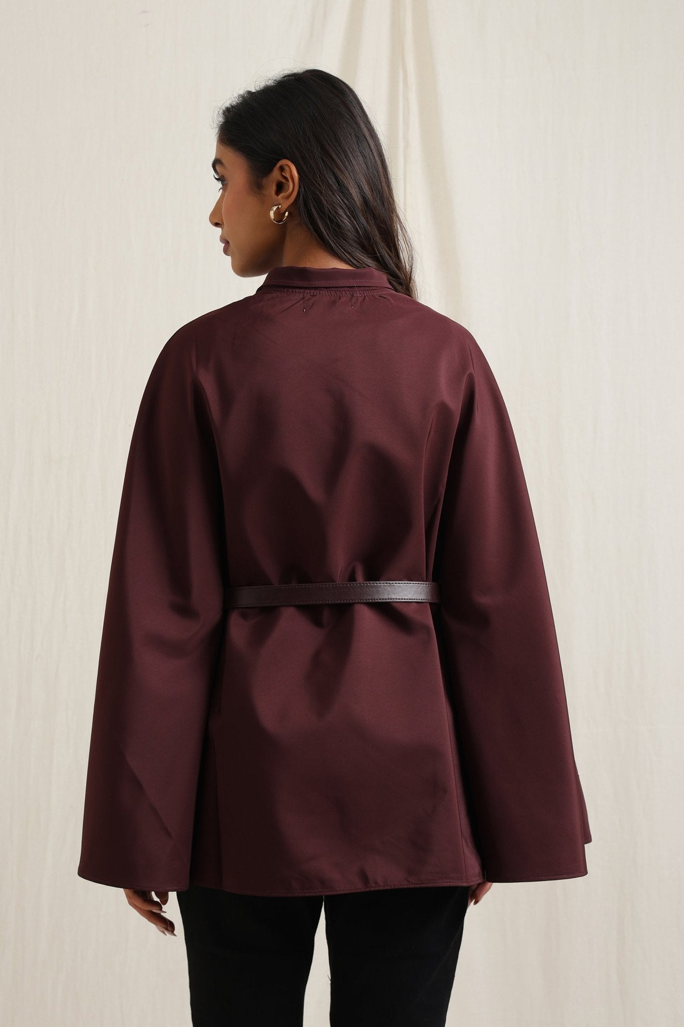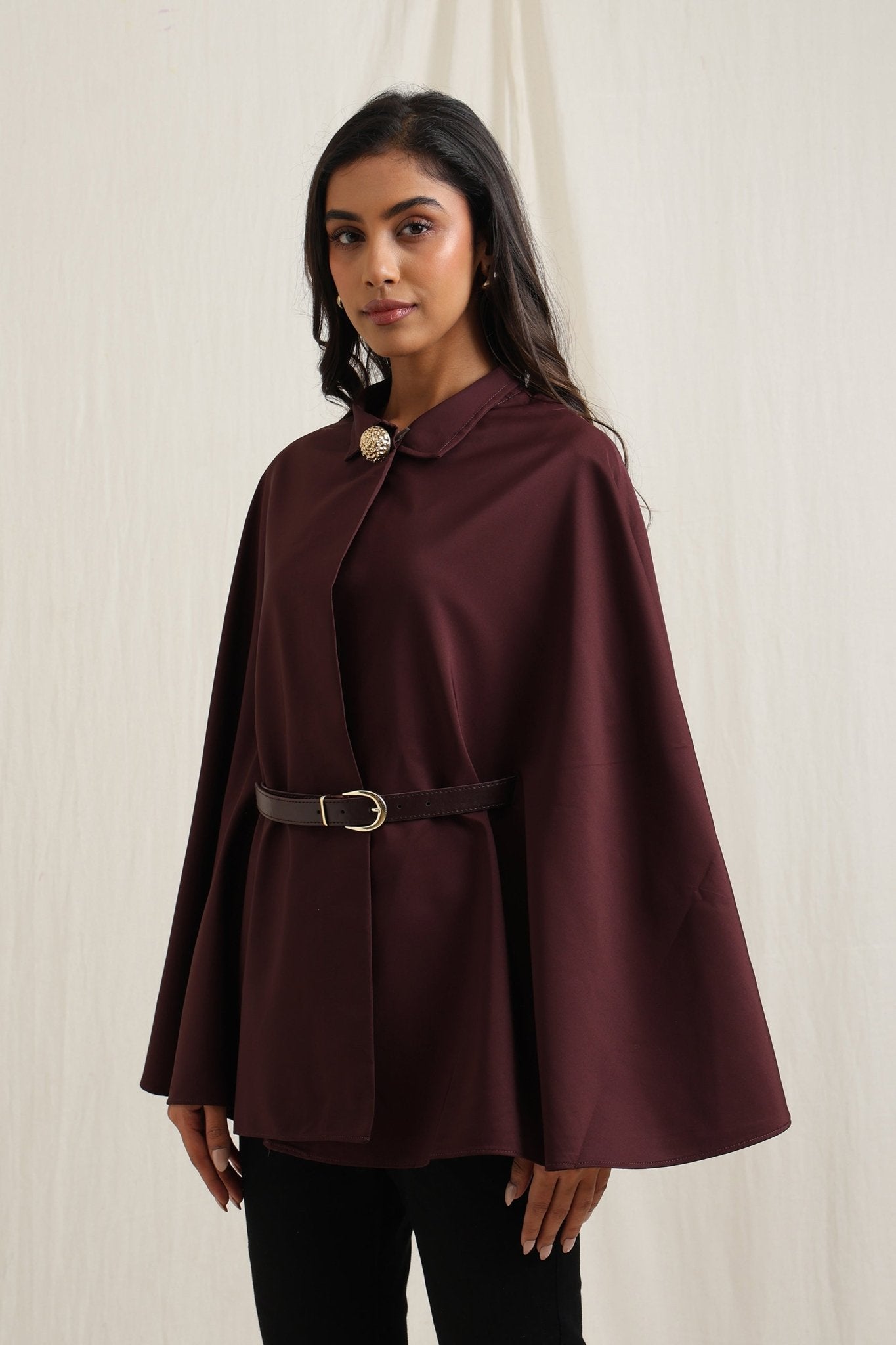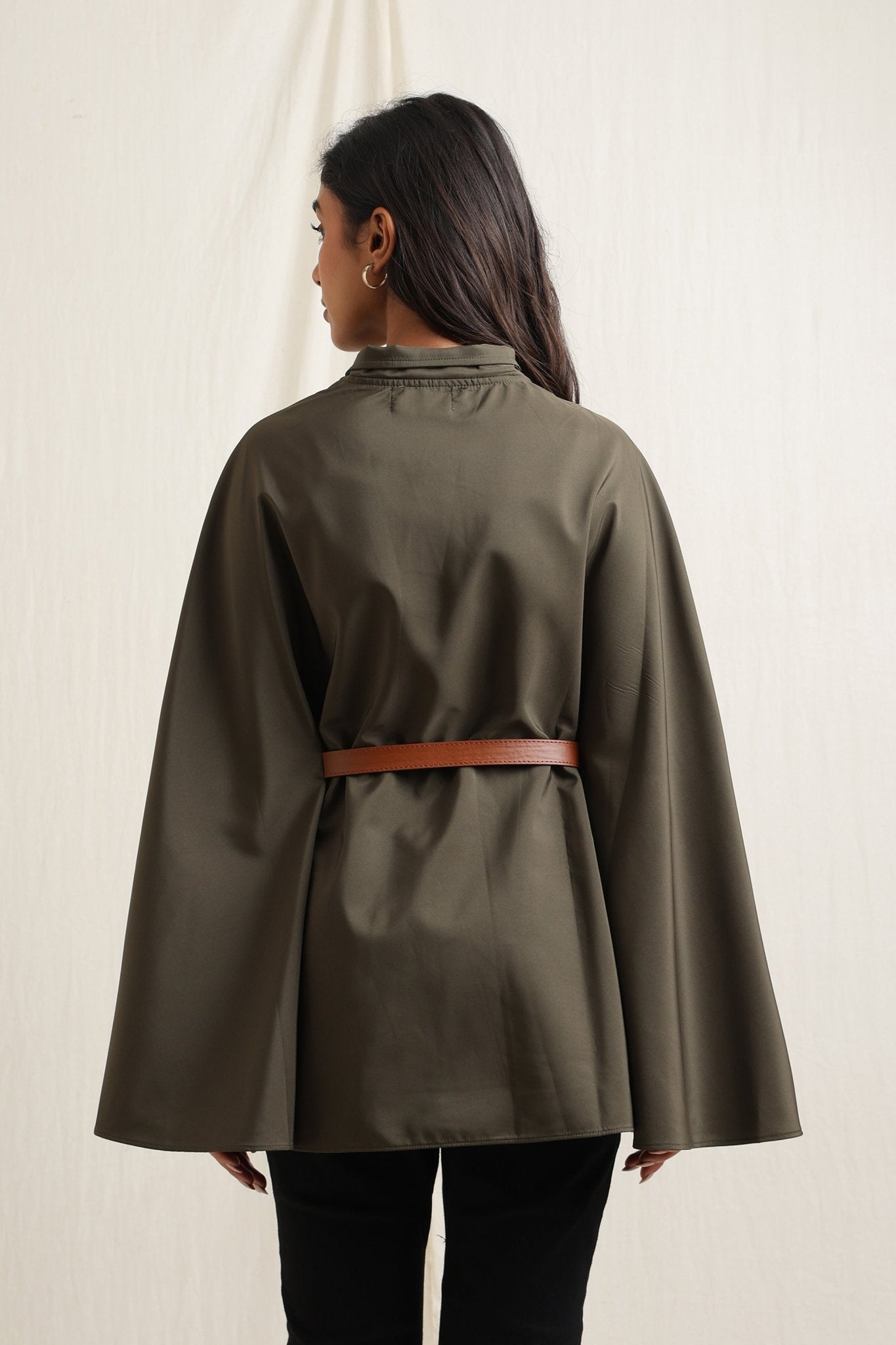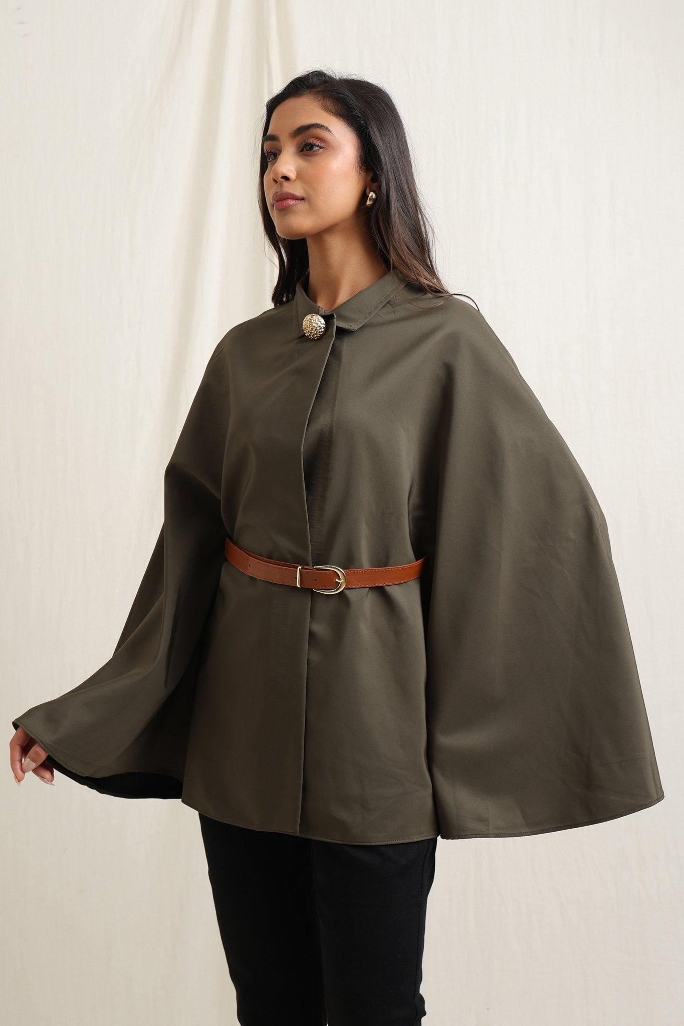 Belted cape featuring a sleek silhouette and adjustable belt for a polished look.