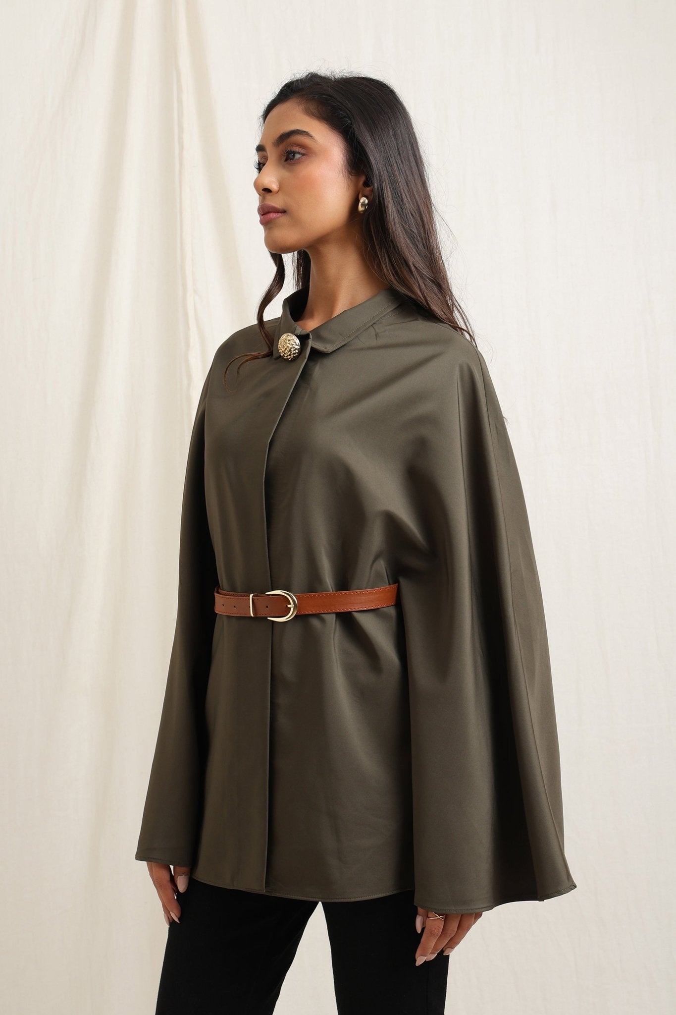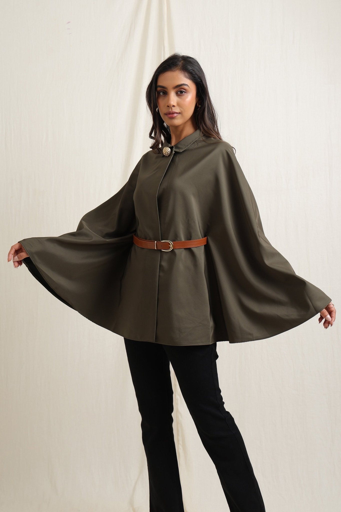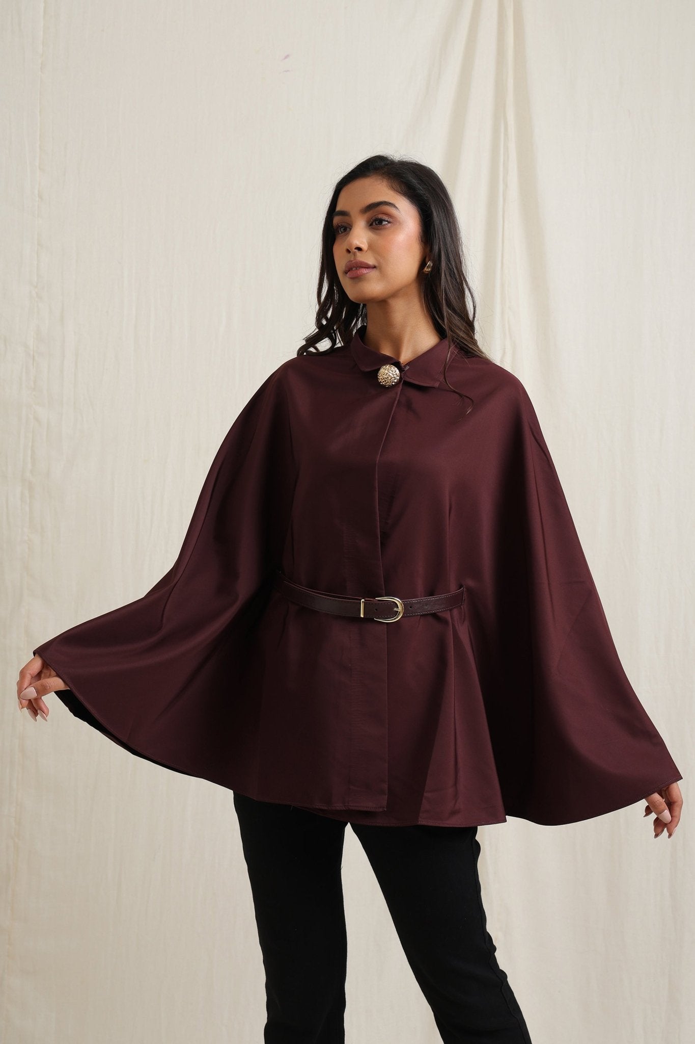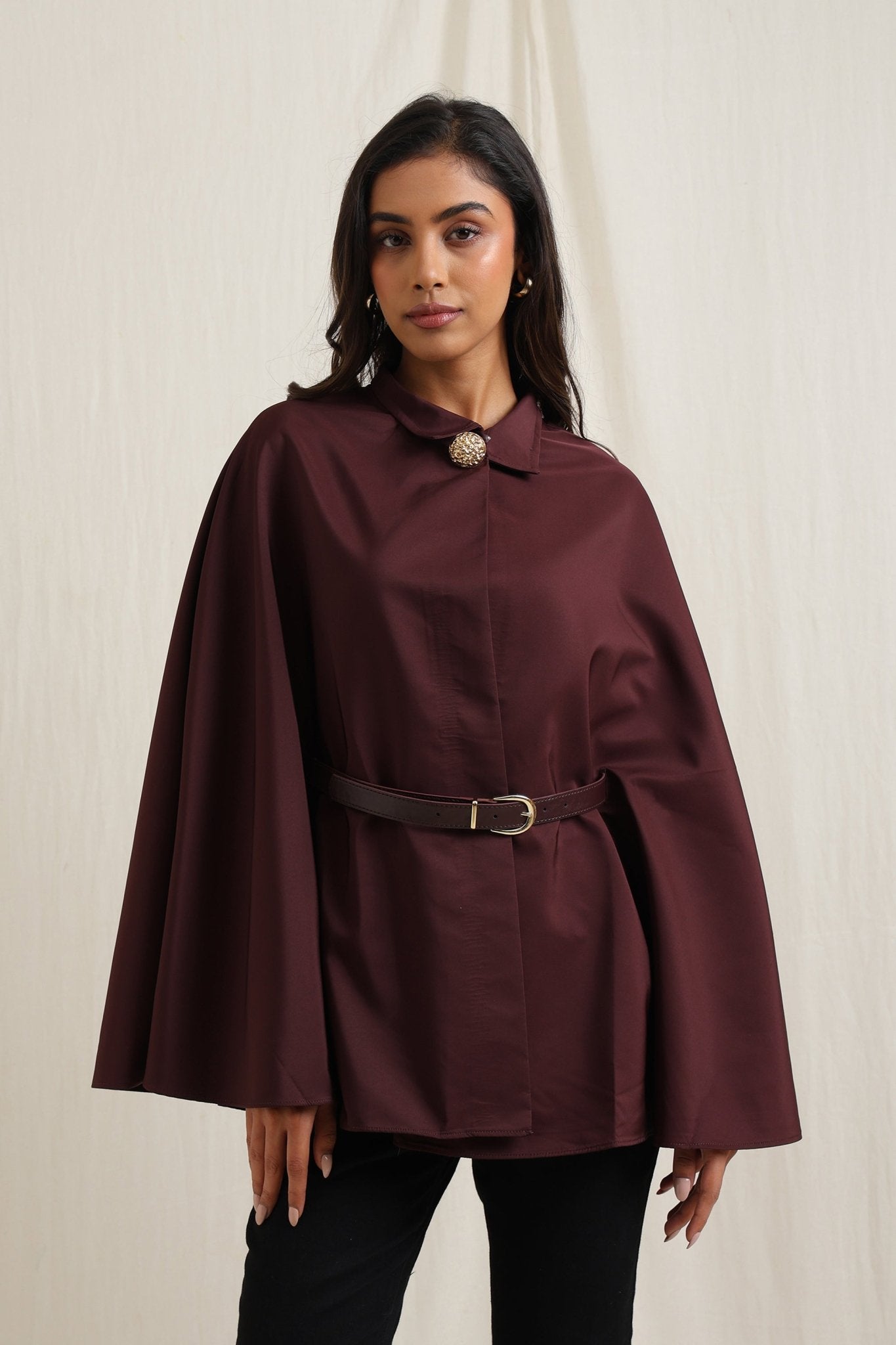 Belted cape featuring a sleek silhouette and adjustable belt for a polished look.