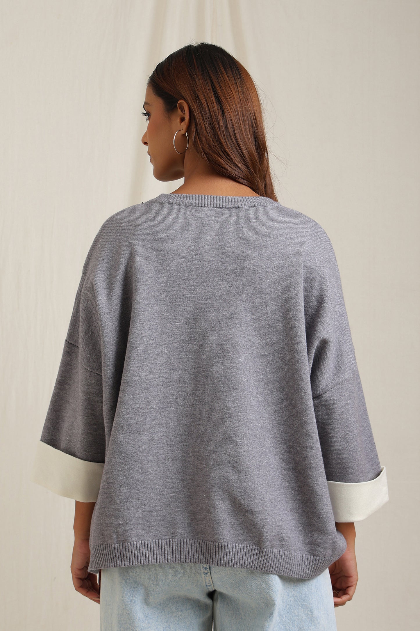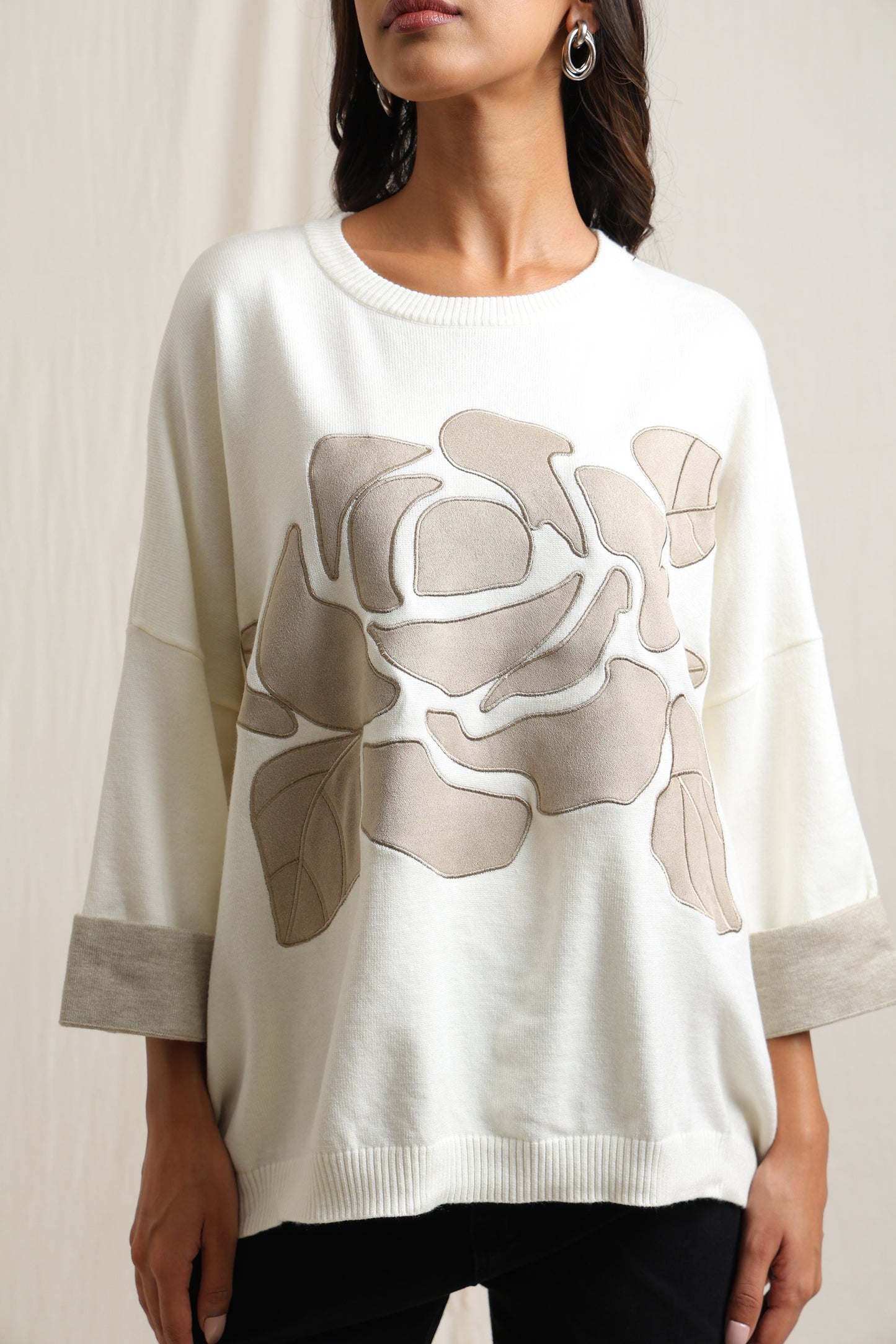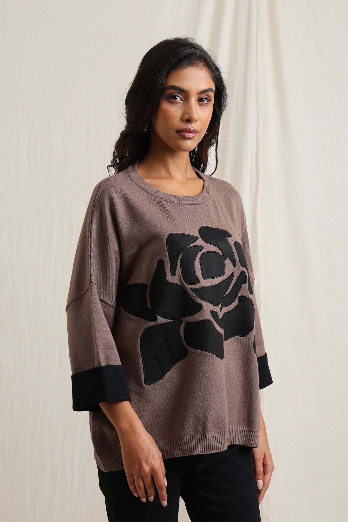 Regular price Rs. 7,000This sweater is defined by its prominent rose motif knitted into the front, delivering a timeless yet bold aesthetic. The floral design adds visual interest, while the relaxed fit ensures comfort