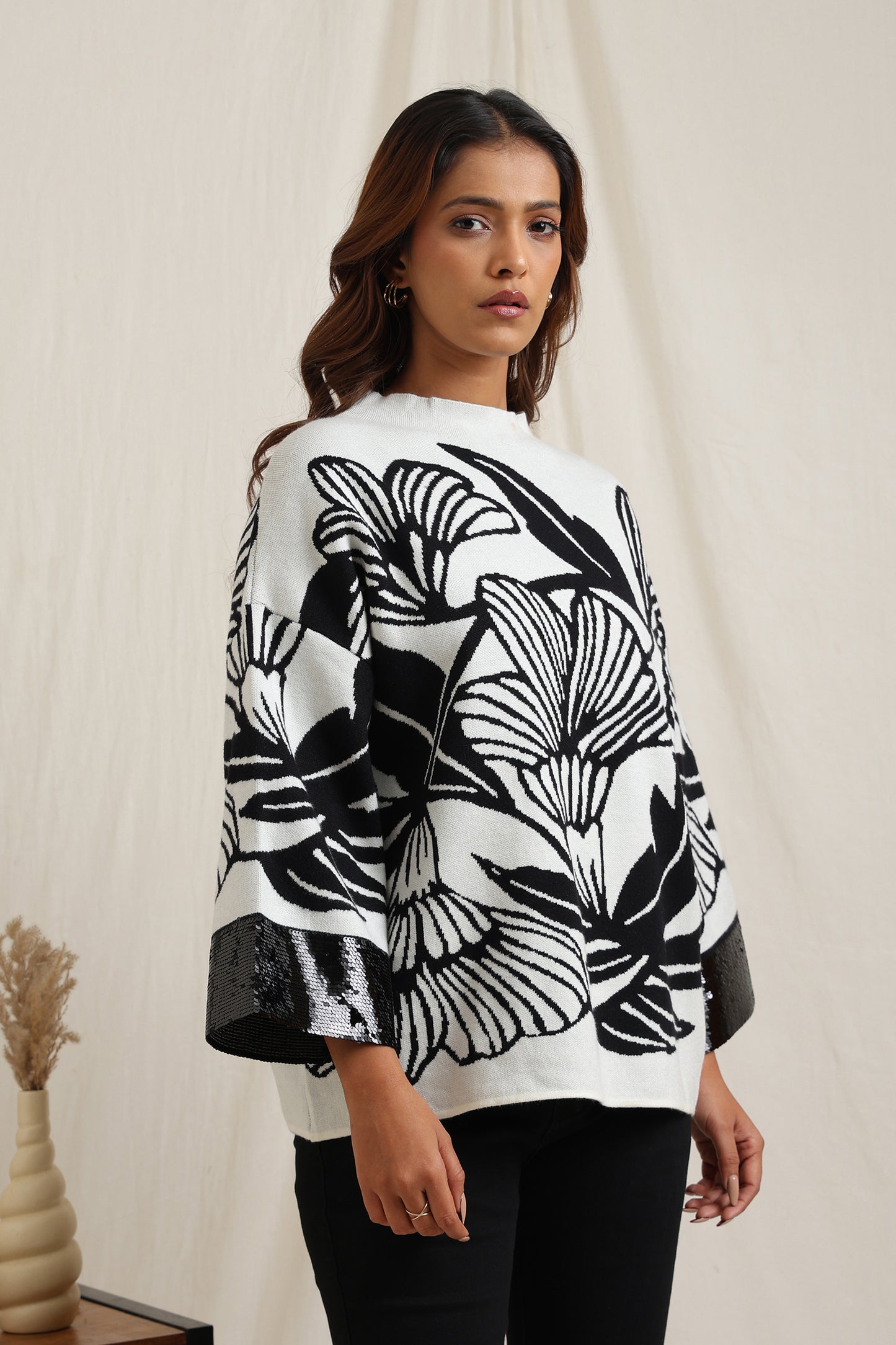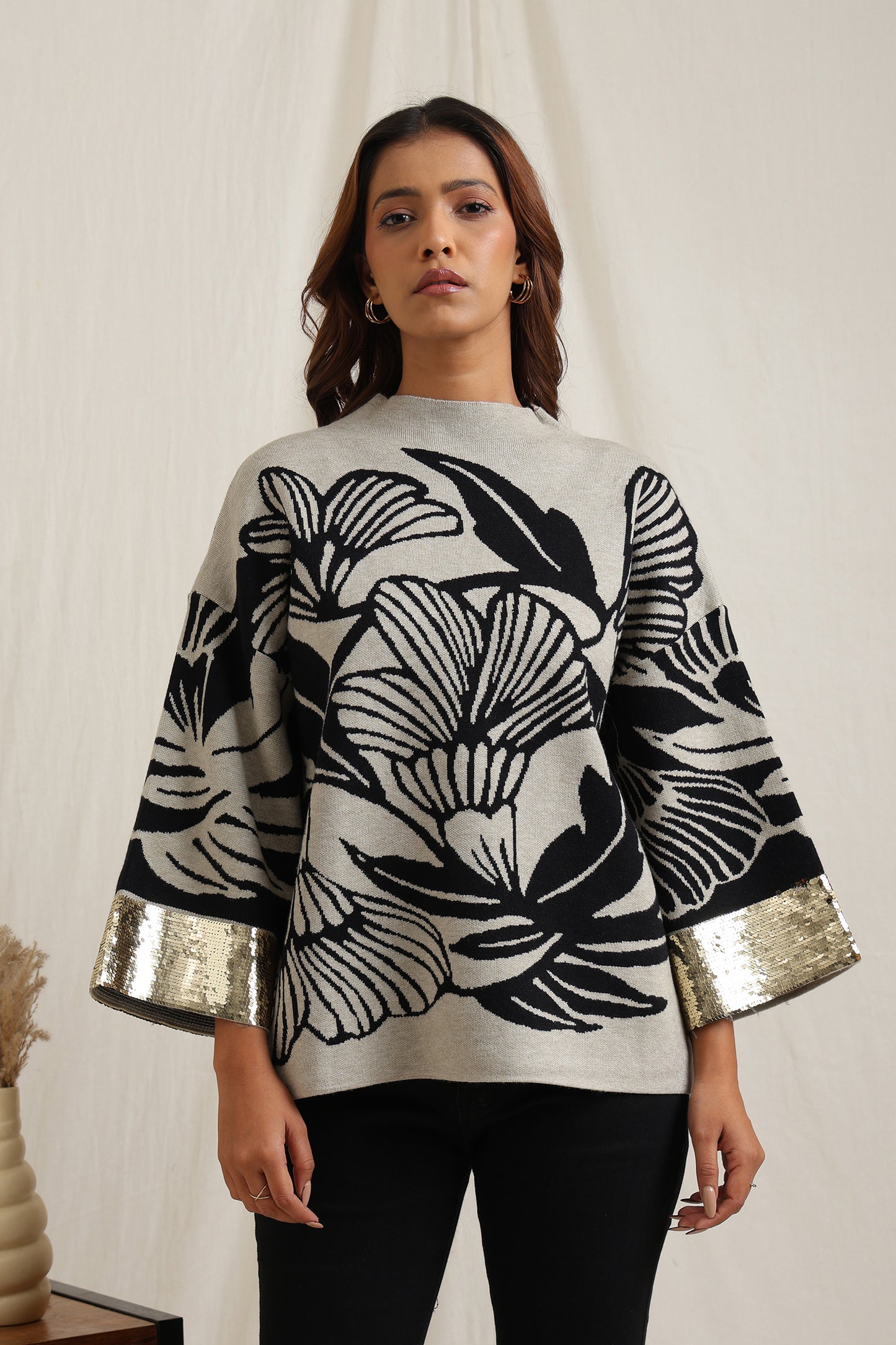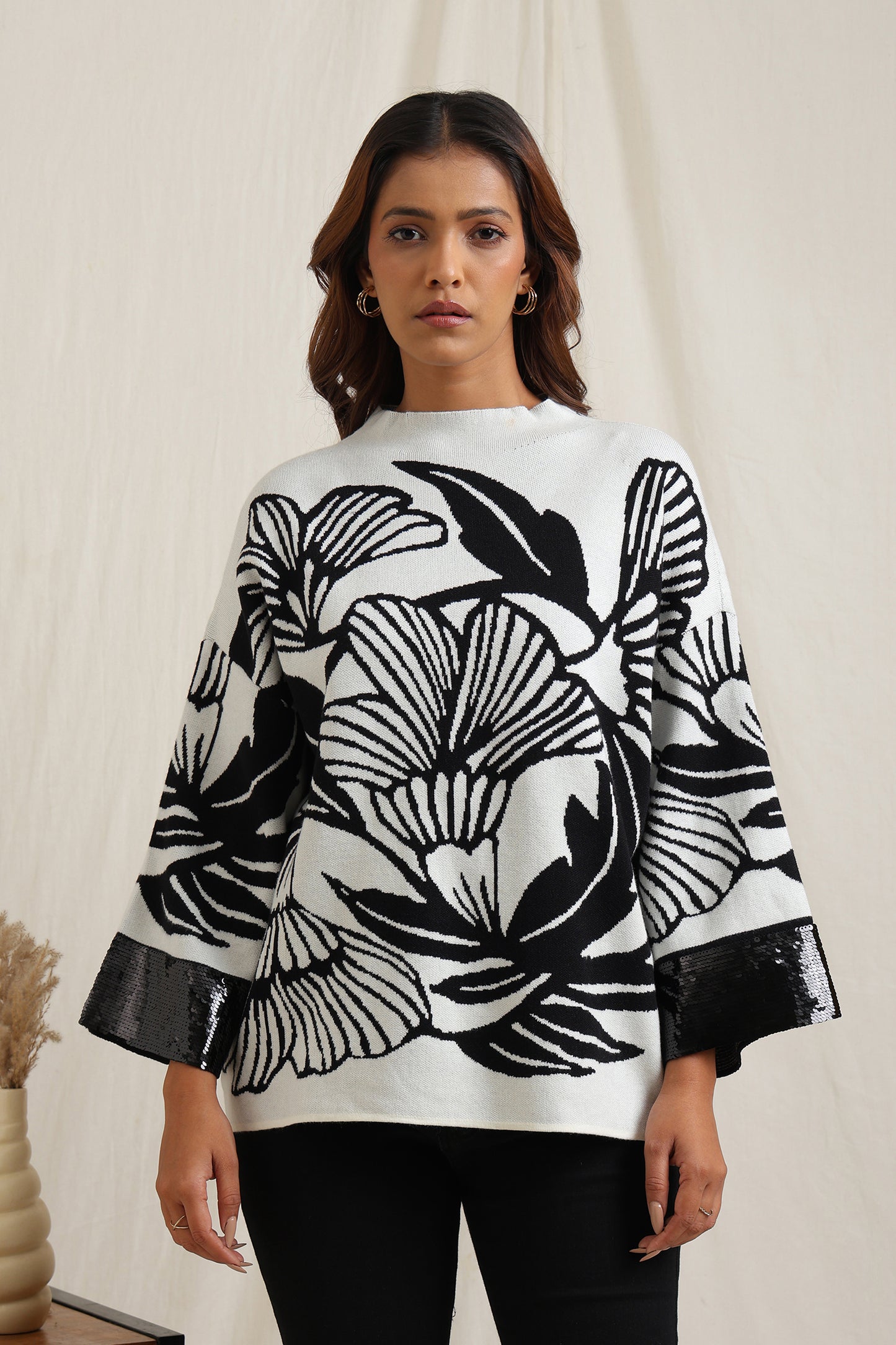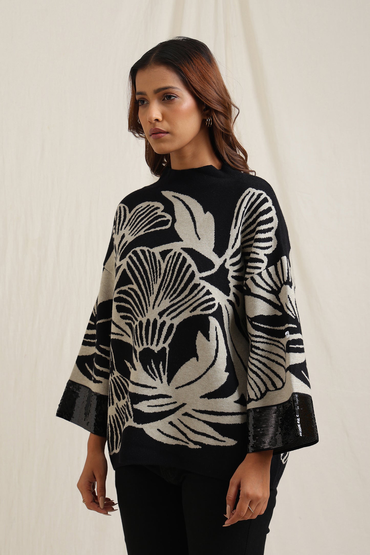 Regular price Rs. 5,600This knitted sweater combines cozy comfort with artistic detailing through its bold floral jacquard pattern. The slightly relaxed fit and structured neckline make it versatile for everyday wear, while the intricate design lends a unique, expressive look