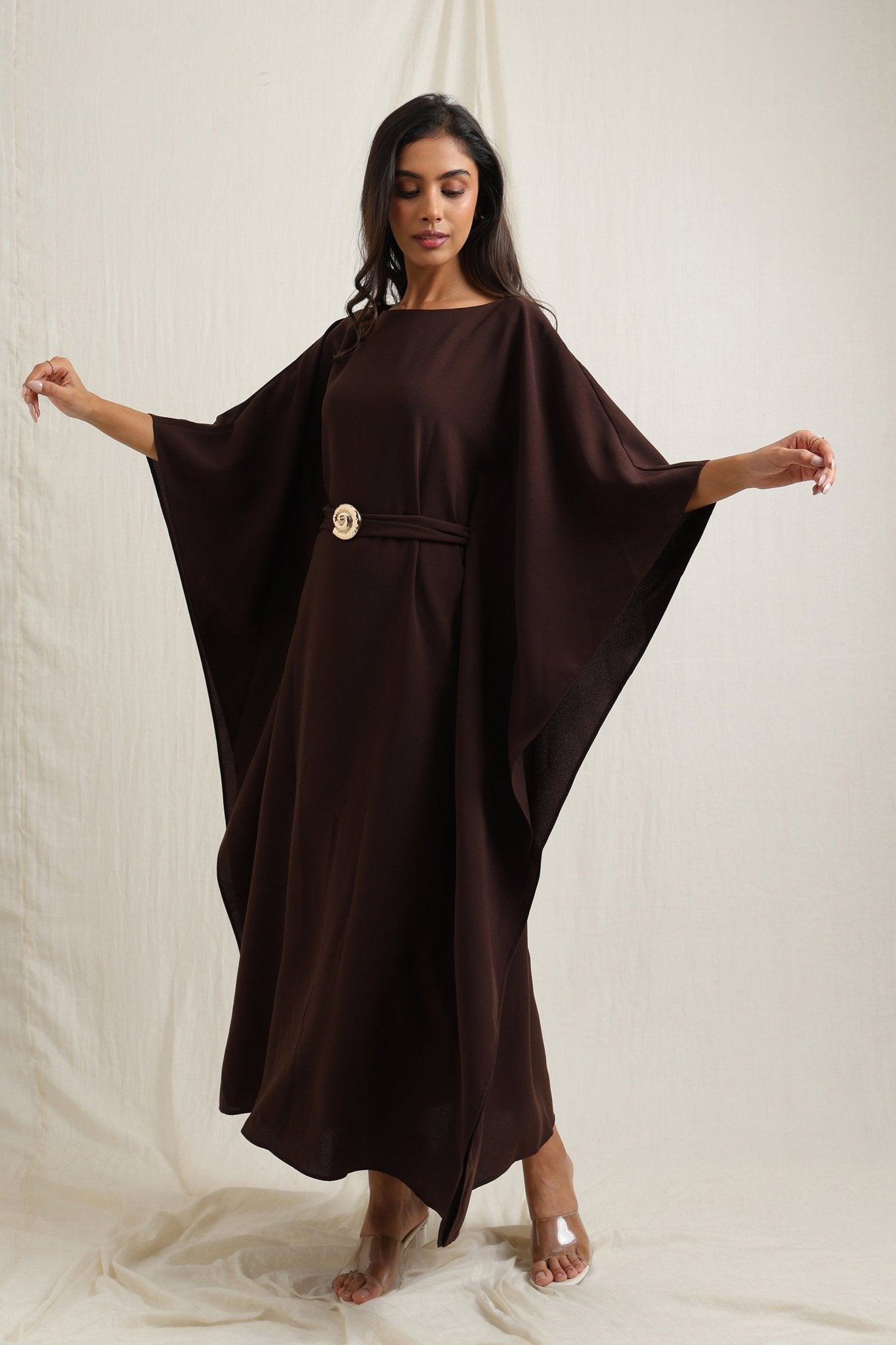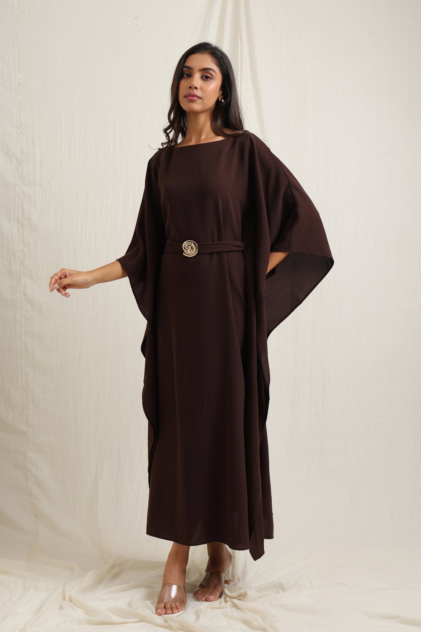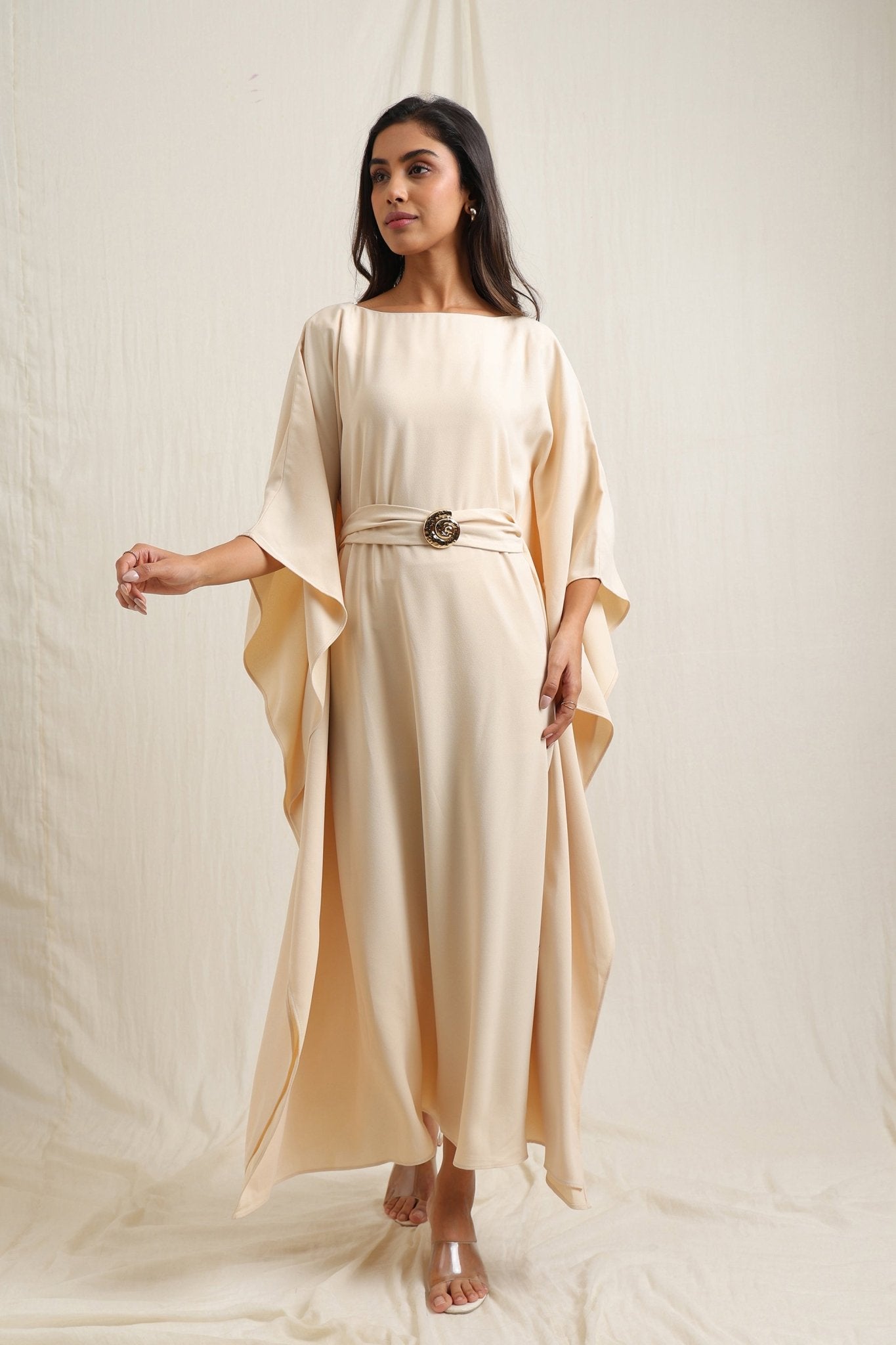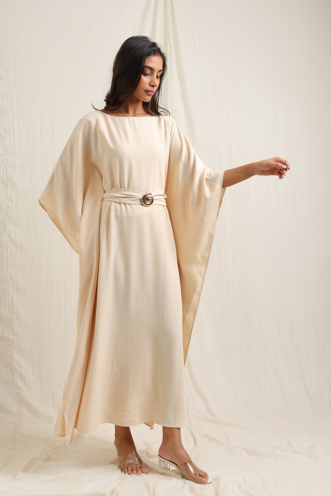 Flowing kaftan-style dress with a waist belt for a flattering fit.