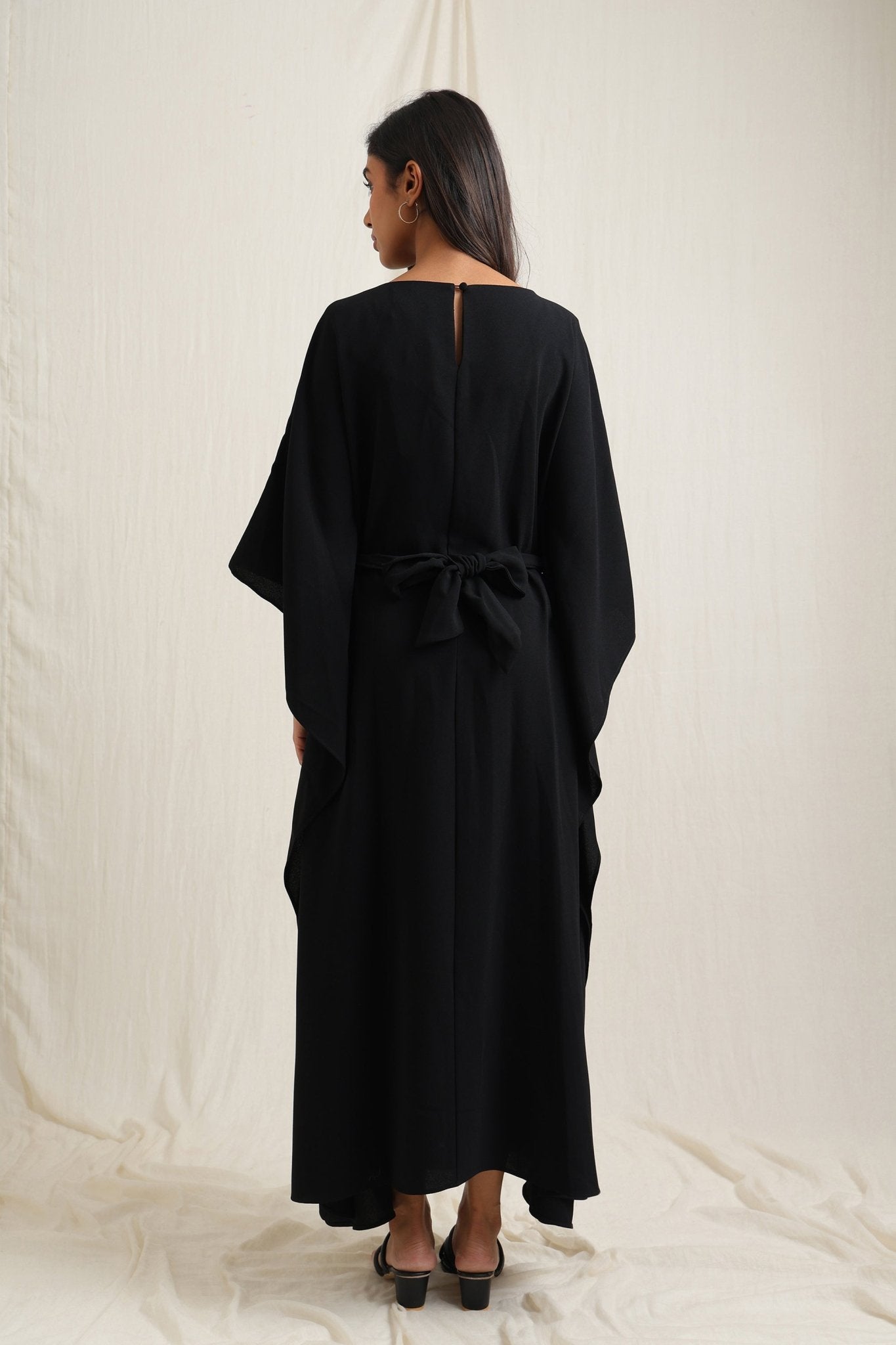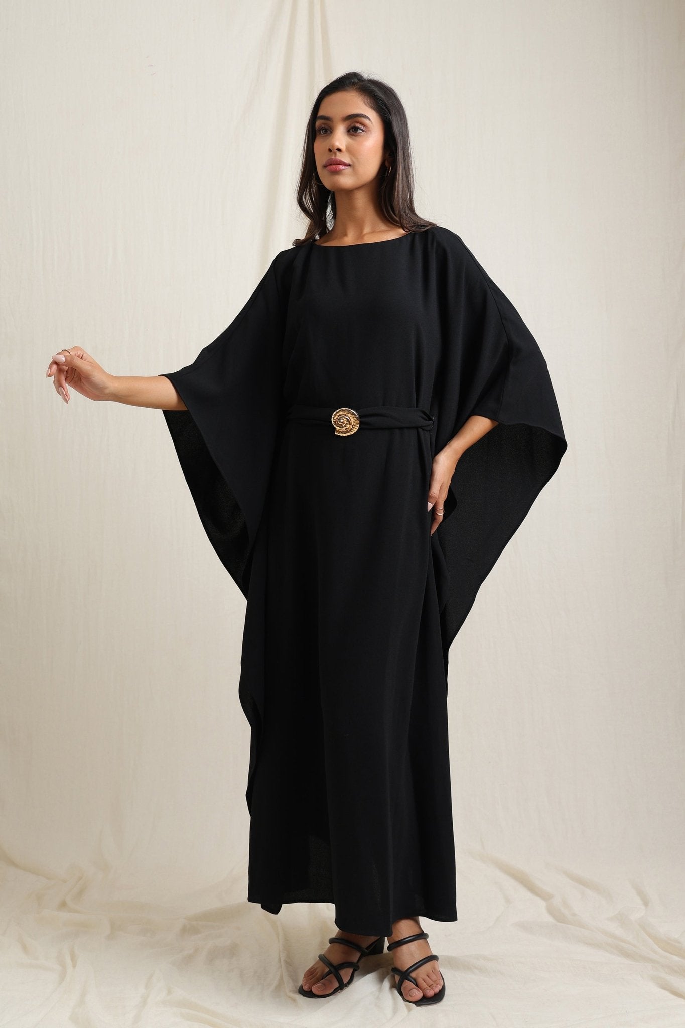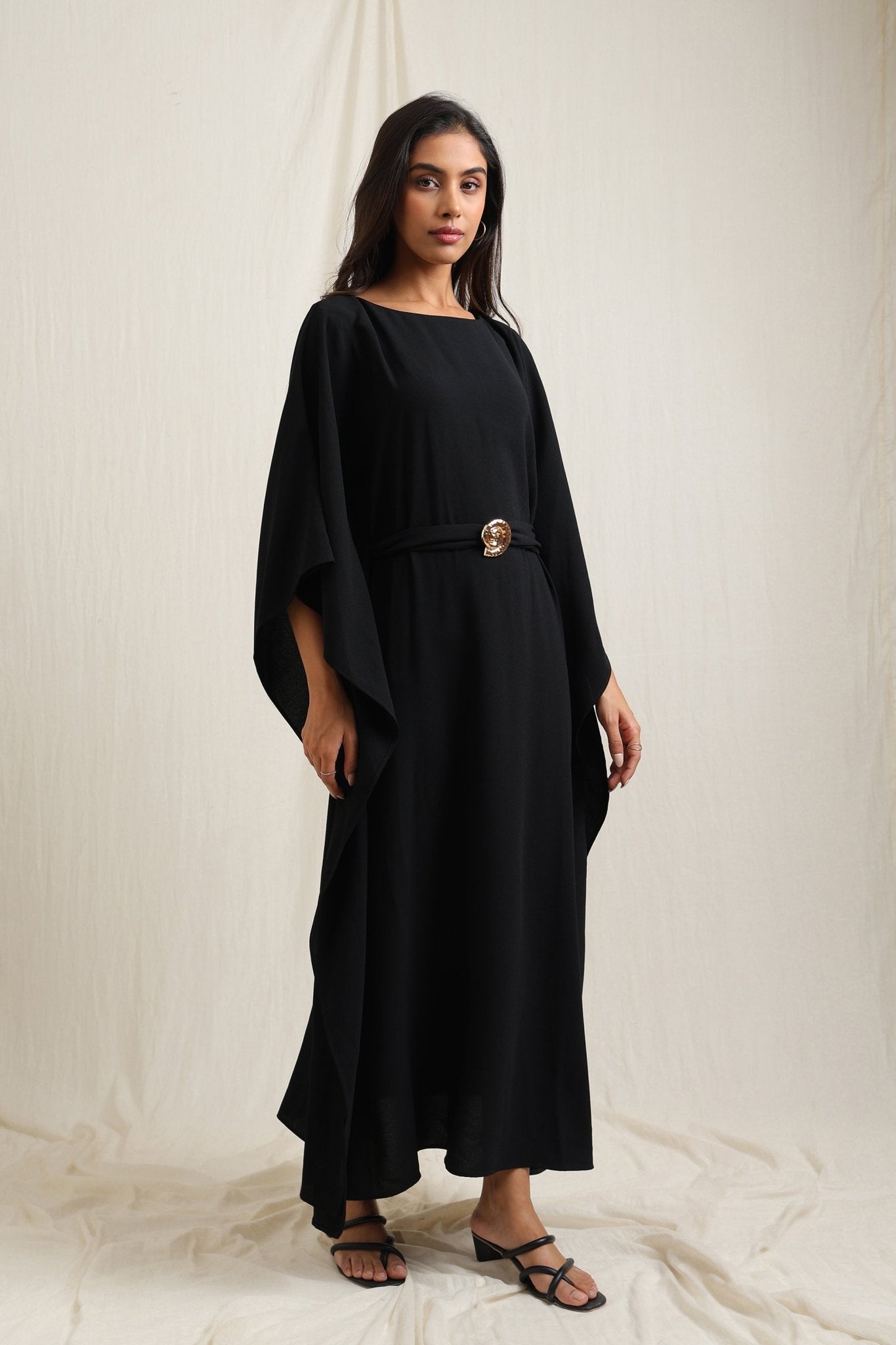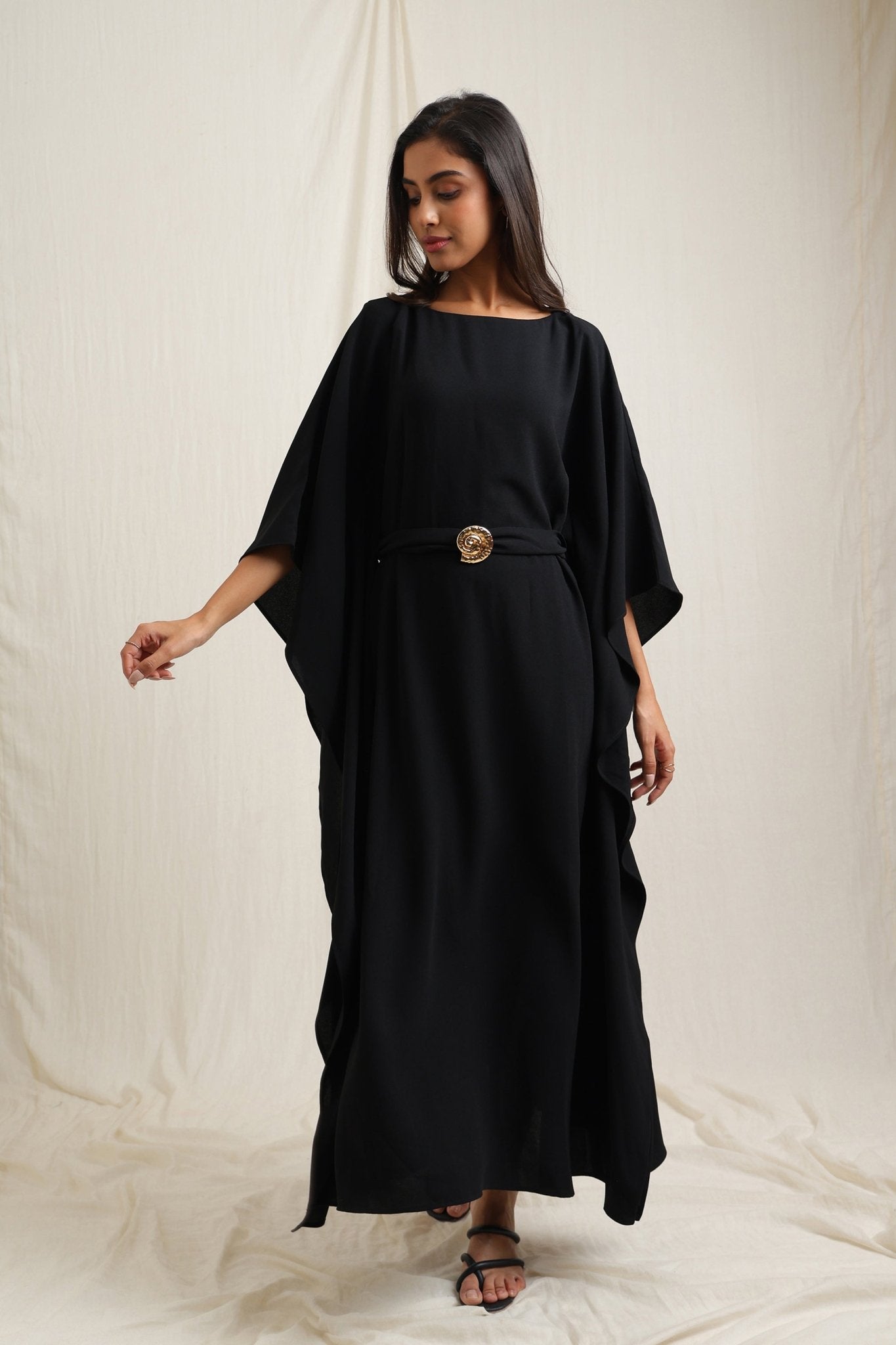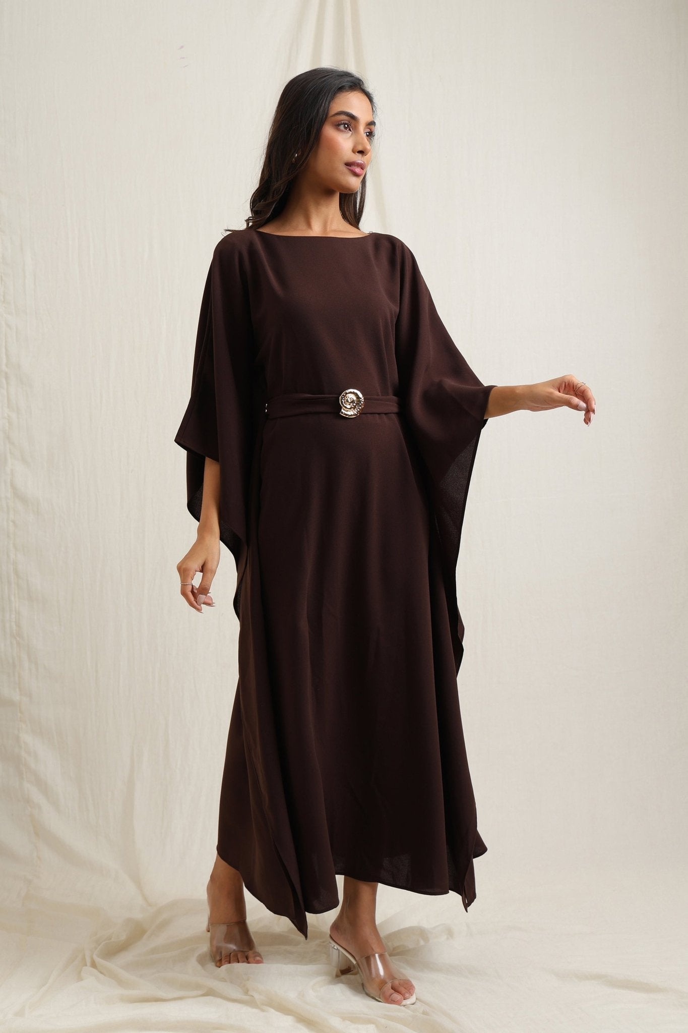 Flowing kaftan-style dress with a waist belt for a flattering fit.