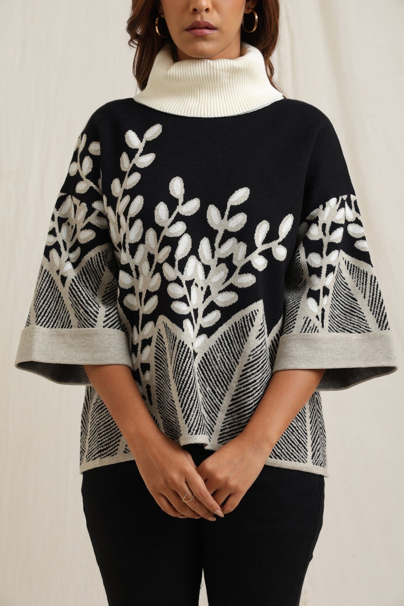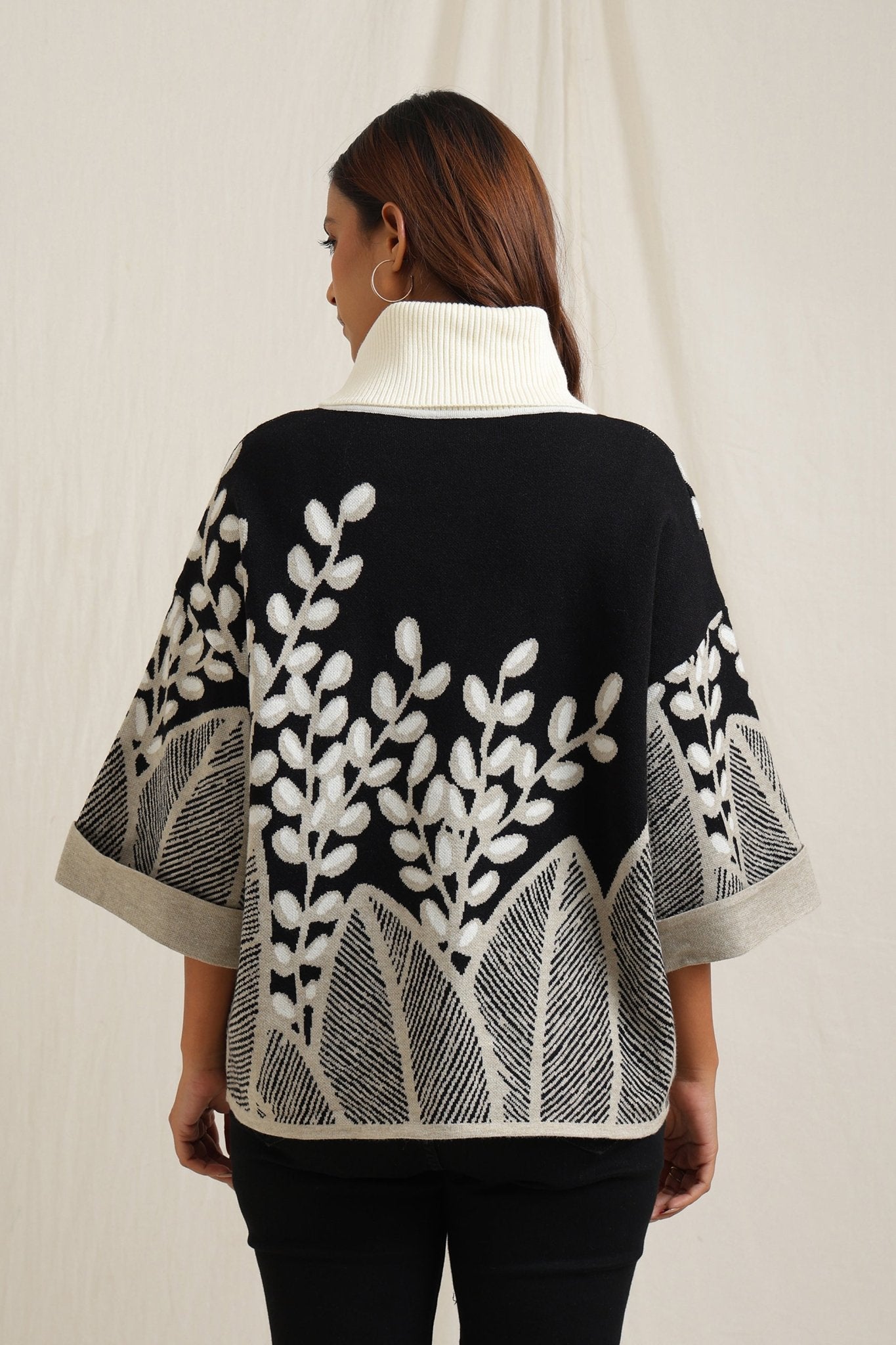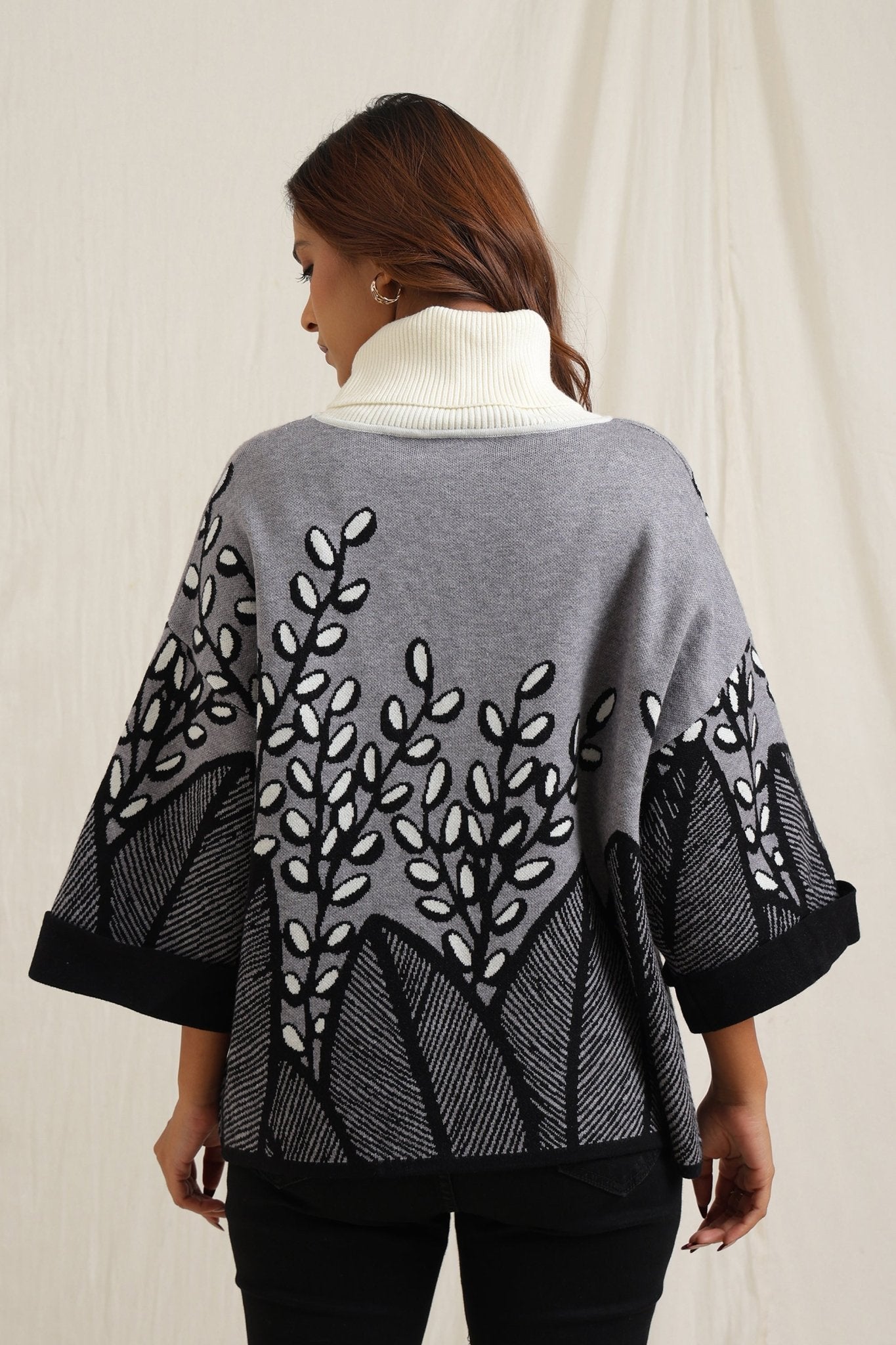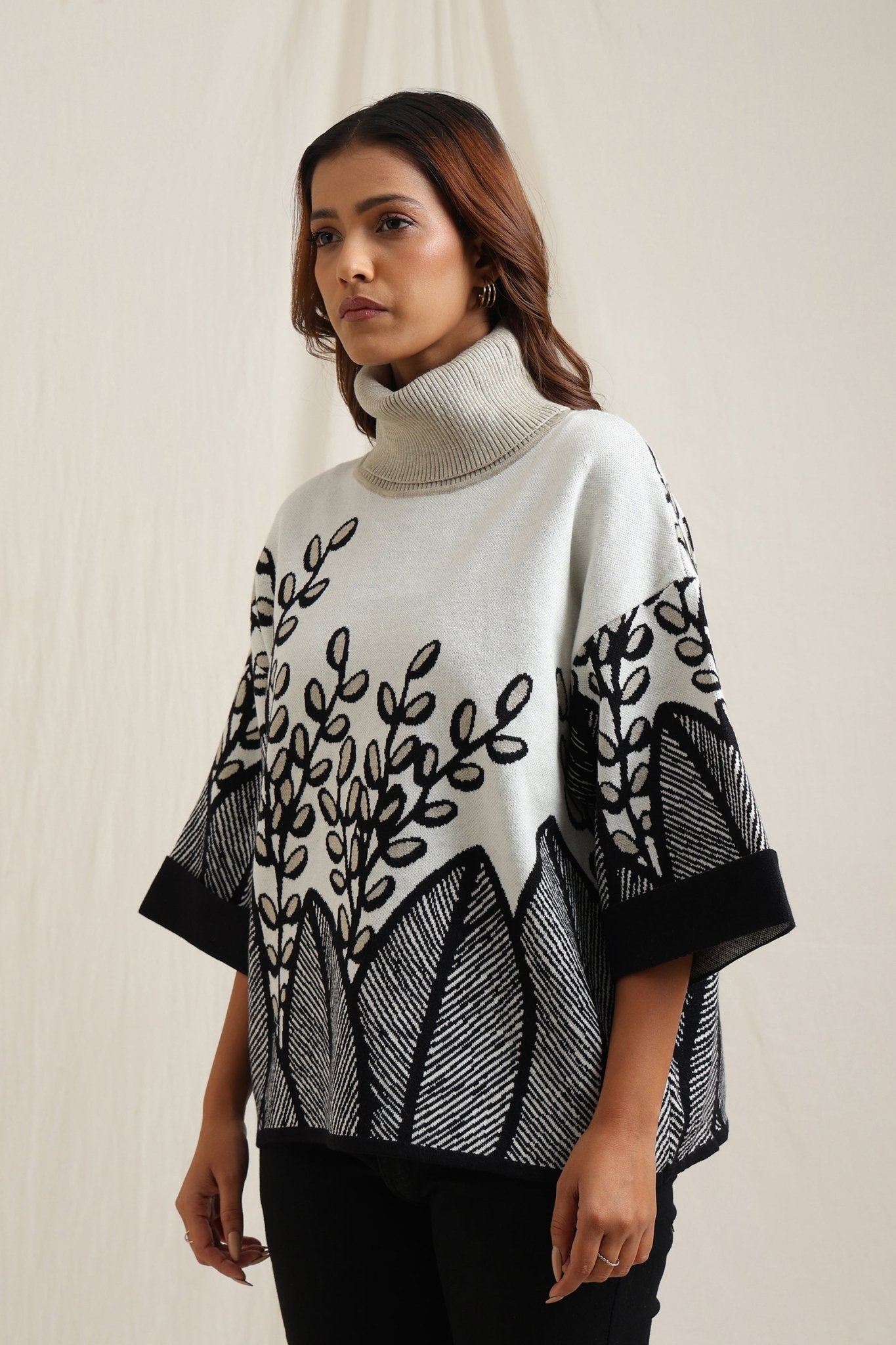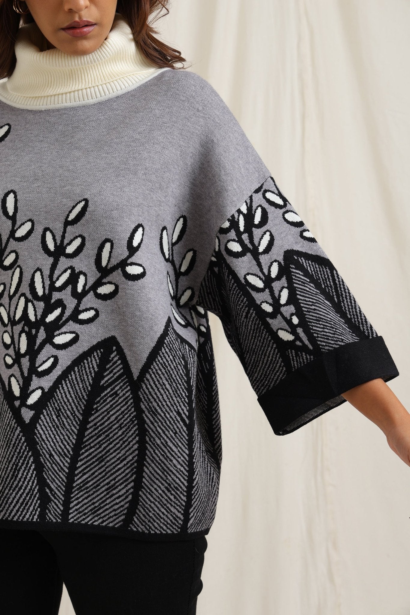 Elegant sweater features a stunning all-over embroidered design of branches and leaves, creating a sophisticated yet natural look. The slightly flared shape adds fluidity and comfort, making it a stylish option for both casual and dressy occasions. The textured embroidery gives it an artisan feel, perfect for adding an artistic touch to your wardrobe