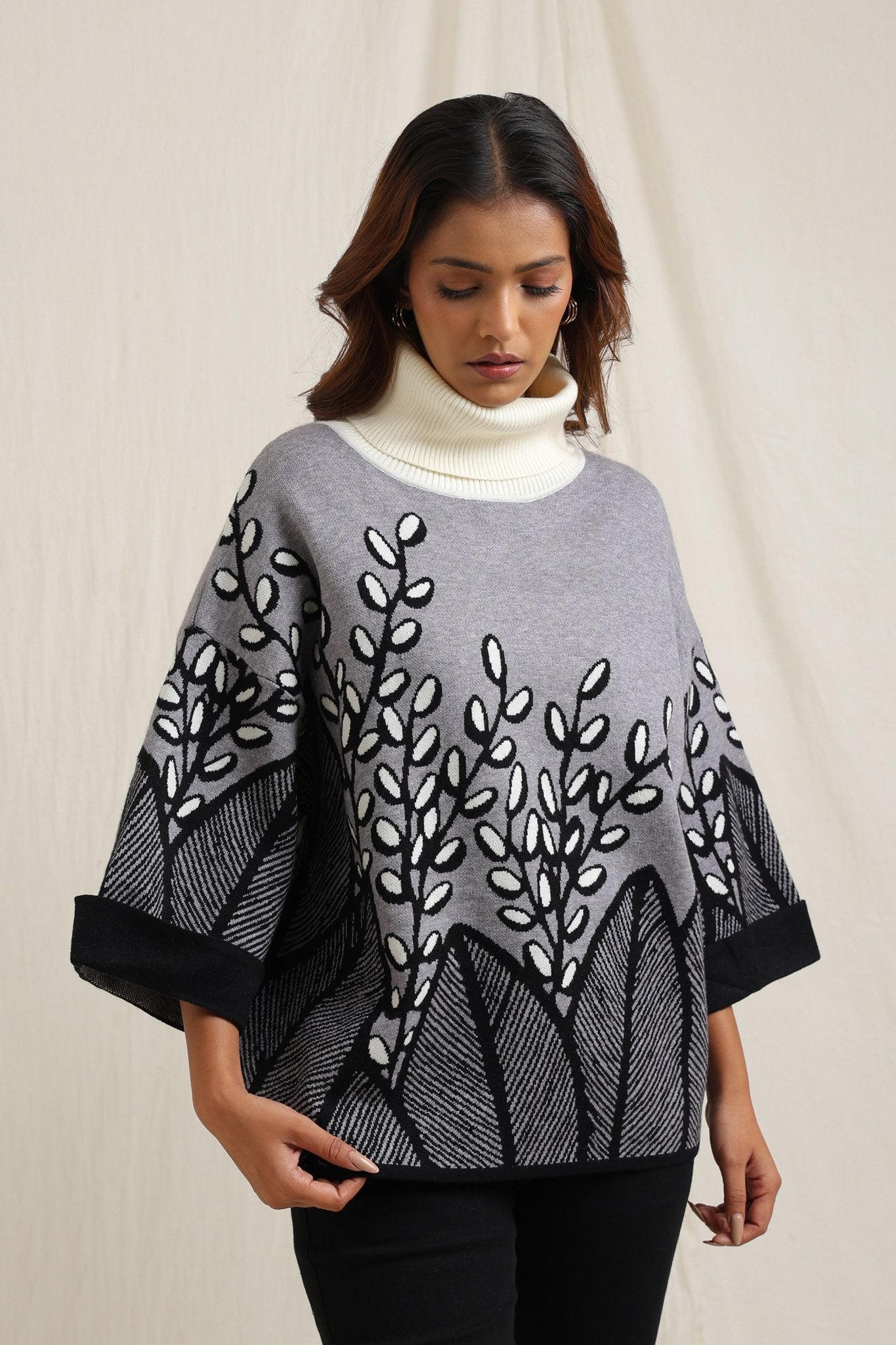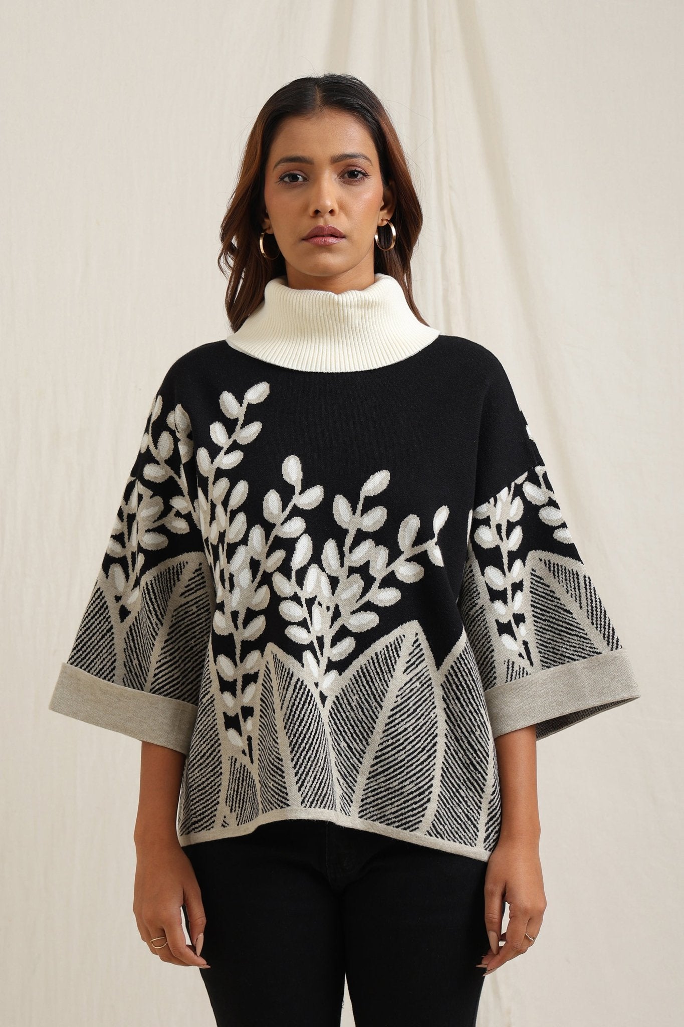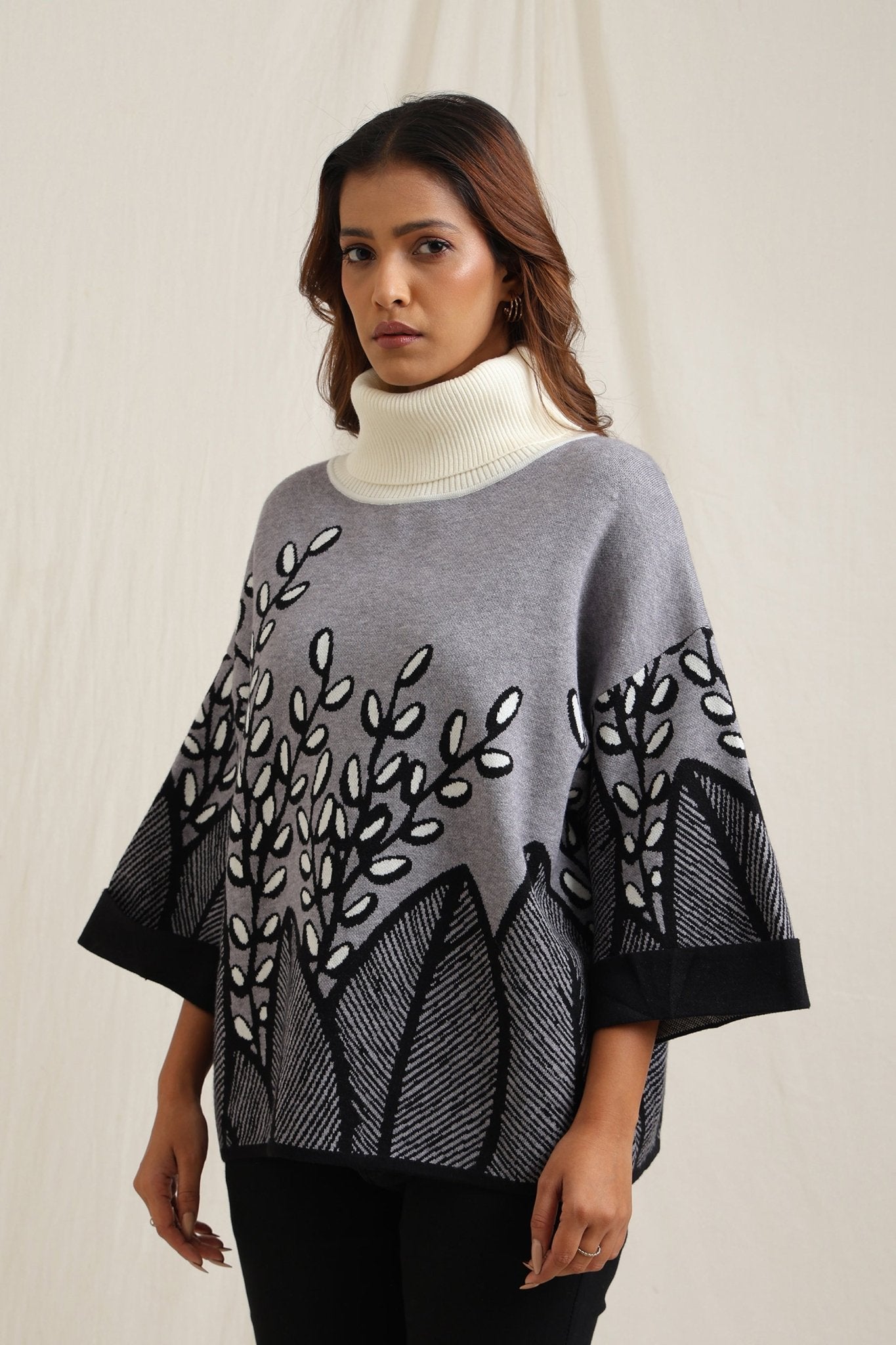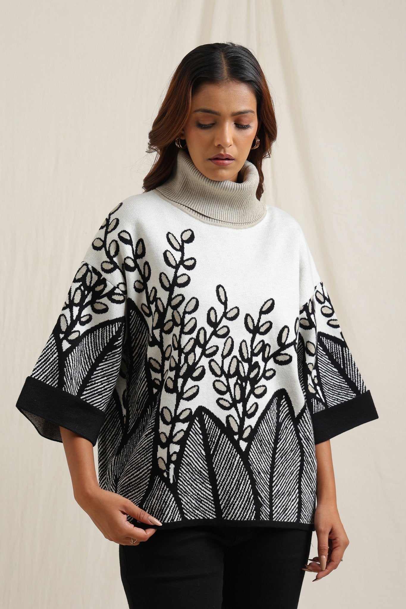 Elegant sweater features a stunning all-over embroidered design of branches and leaves, creating a sophisticated yet natural look. The slightly flared shape adds fluidity and comfort, making it a stylish option for both casual and dressy occasions. The textured embroidery gives it an artisan feel, perfect for adding an artistic touch to your wardrobe