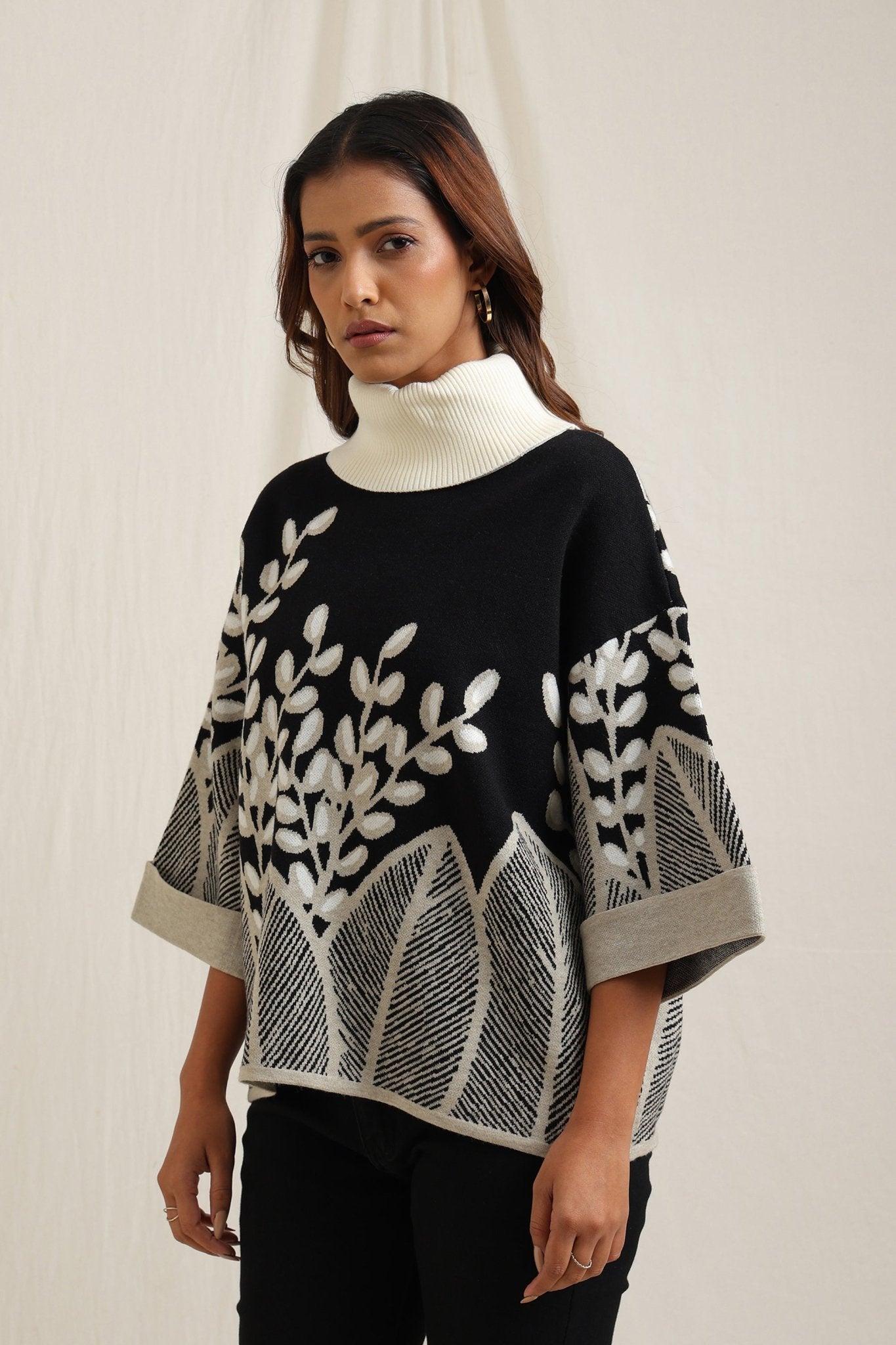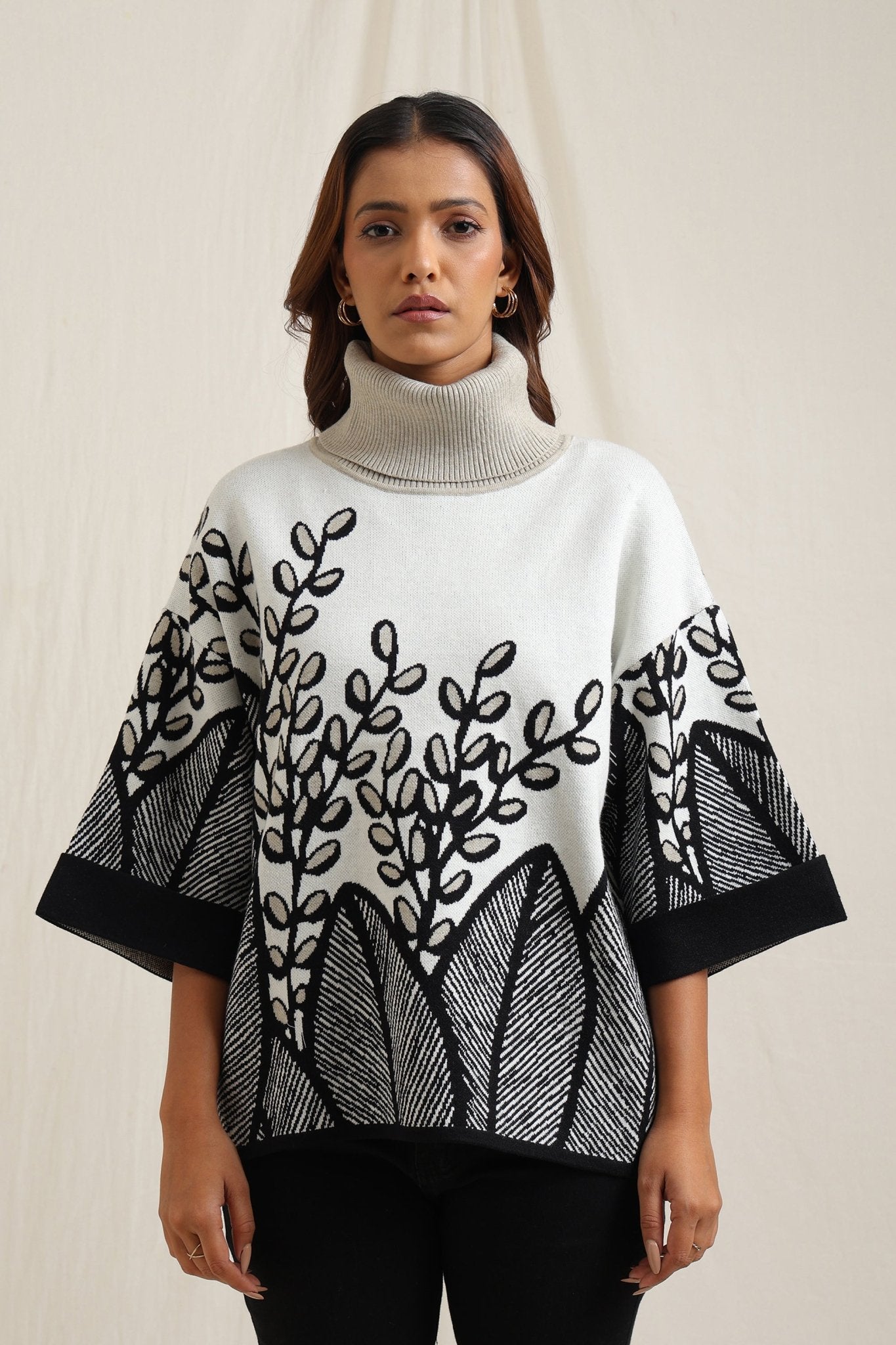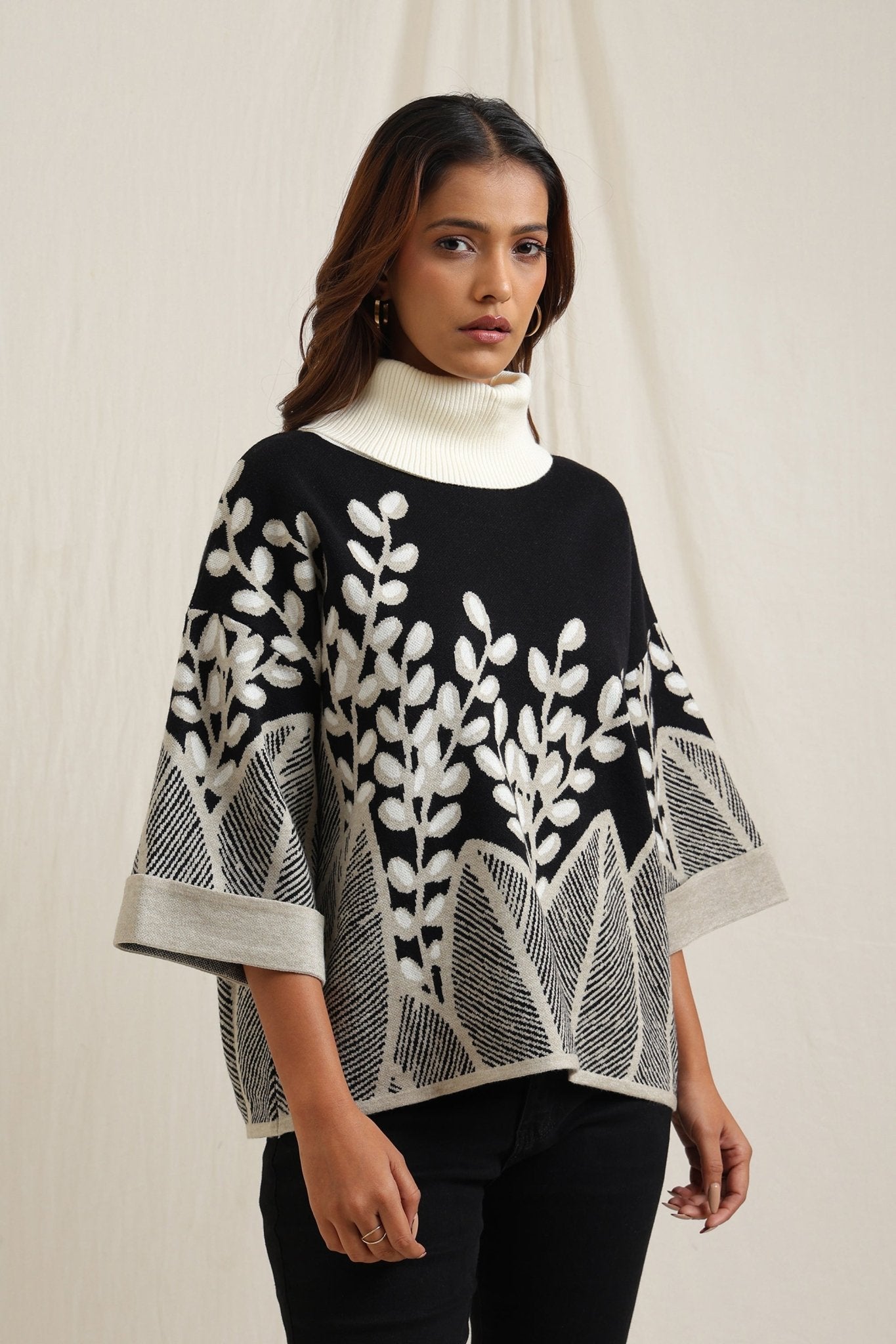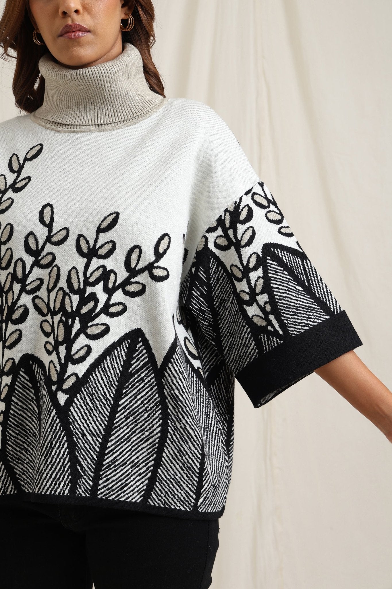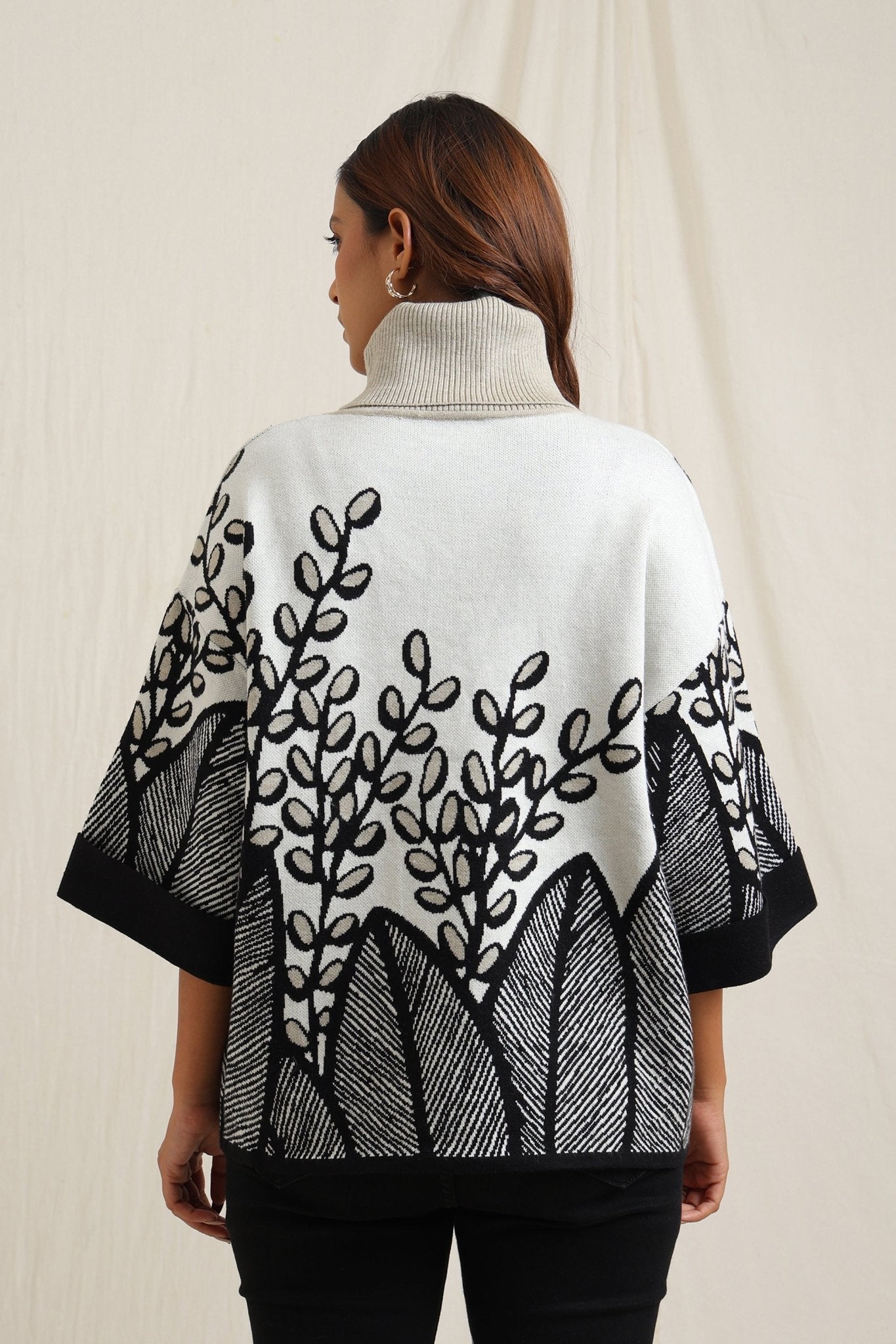 Elegant sweater features a stunning all-over embroidered design of branches and leaves, creating a sophisticated yet natural look. The slightly flared shape adds fluidity and comfort, making it a stylish option for both casual and dressy occasions. The textured embroidery gives it an artisan feel, perfect for adding an artistic touch to your wardrobe