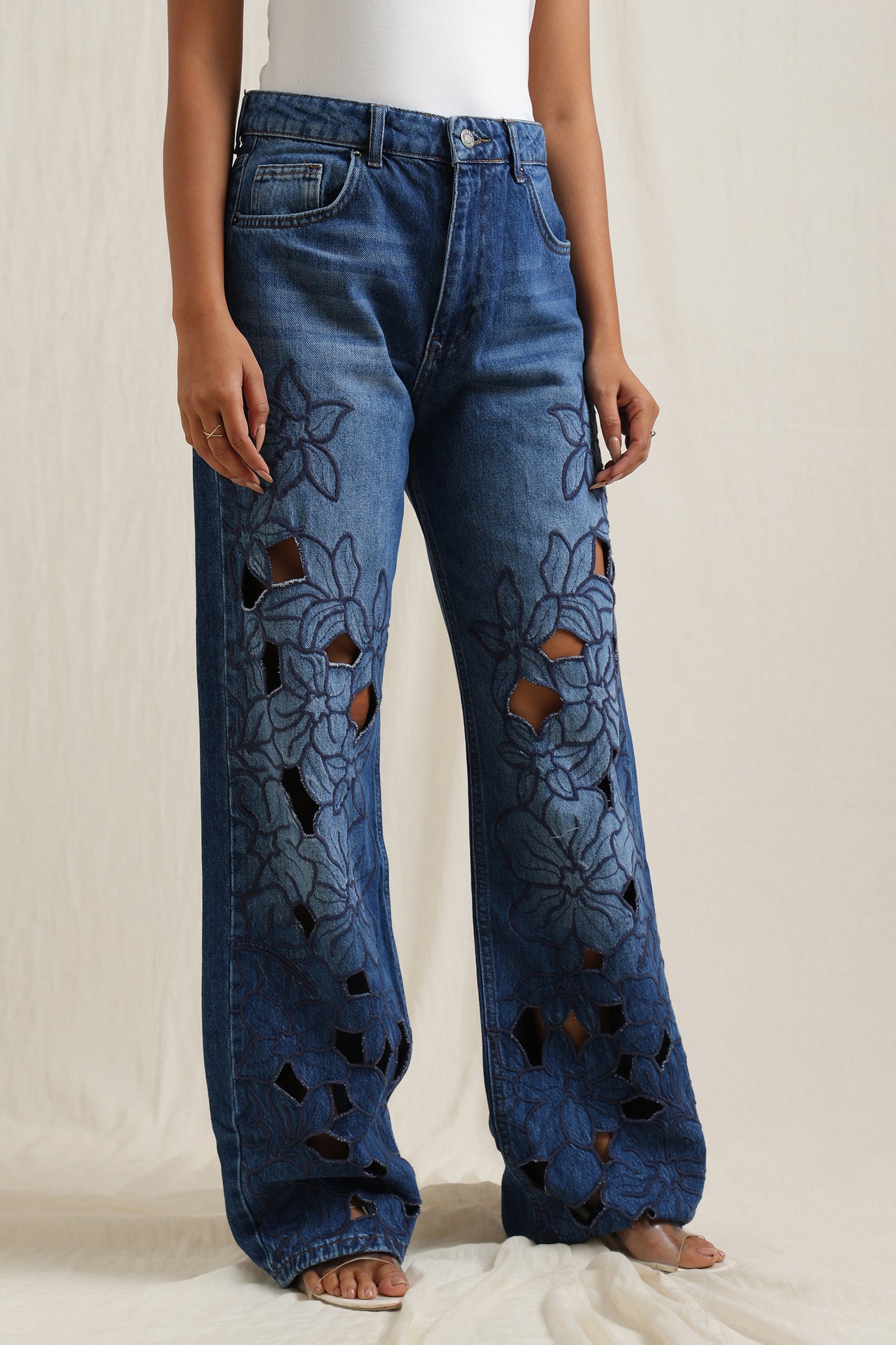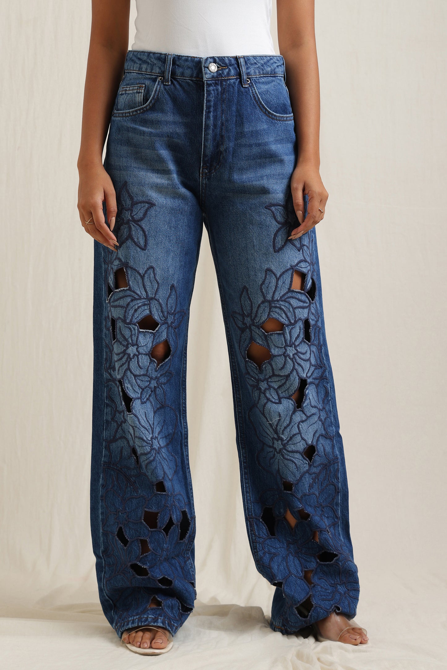 Loose cut-out jeans featuring intricate cutwork for an elevated, fashion-forward look.