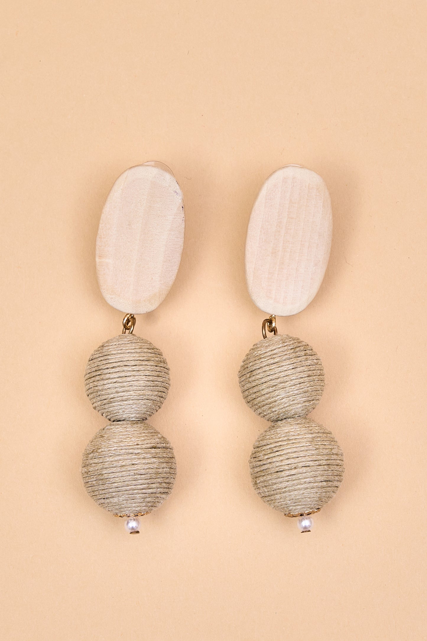 Elegant drop earrings feature wrapped fabric spheres in soft cream tones. Minimalist yet eye-catching for any outfit.